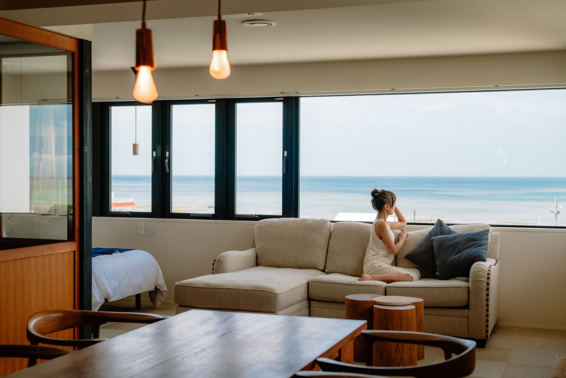 独創的な客室デザインはナチュラルな空間で、落ち着いた雰囲気。バスルームを2つ配したグループ滞在も快適な機能性と、どこにいても居心地が良く、海と空の景色を眺めながら「ずっとここに居たい」と感じる客室となっております。