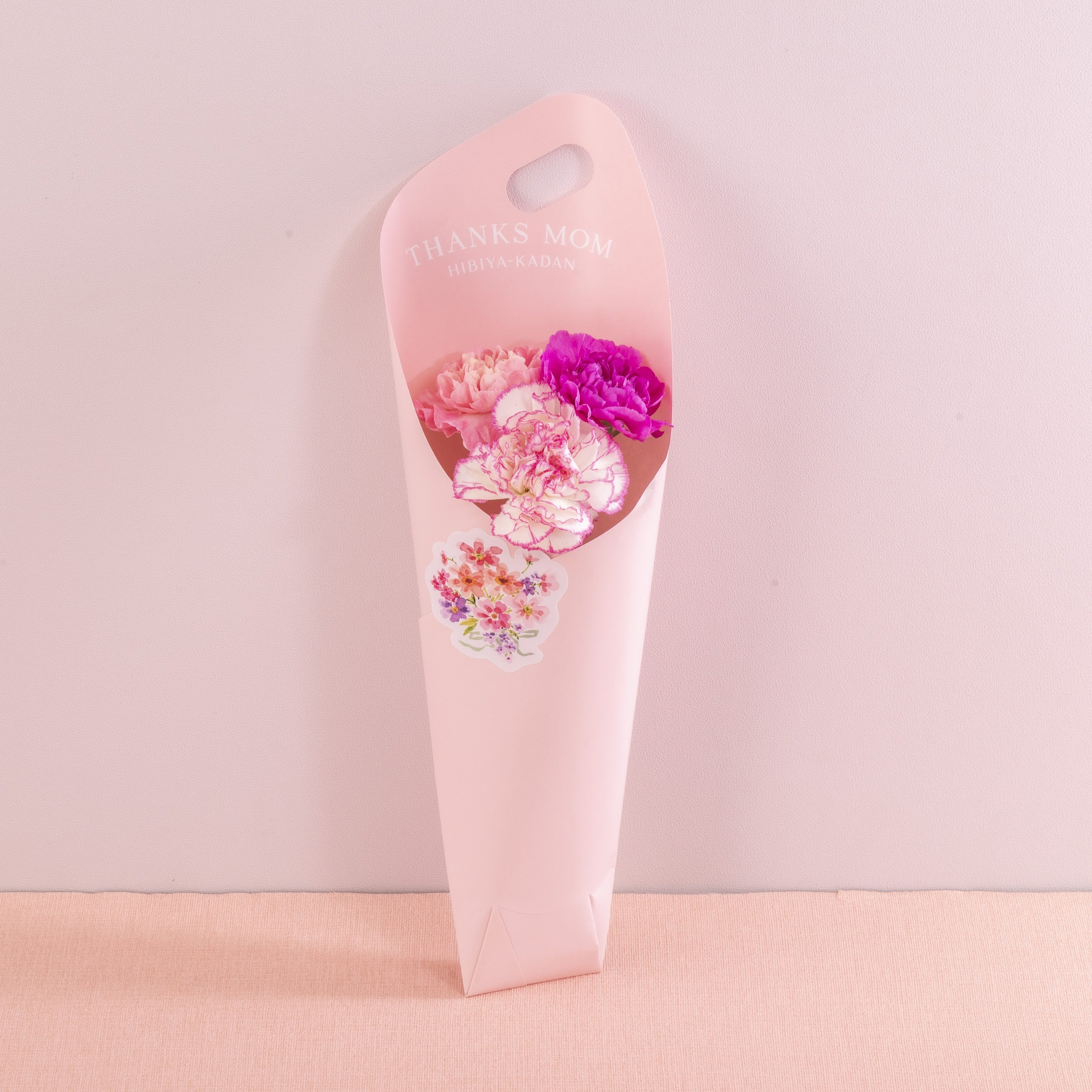 シュシュフルールは花瓶も水替えも不要でそのまま飾れるブーケです。花びらの形をしたラッピングペーパーで色鮮やかなカーネーションを包みました。