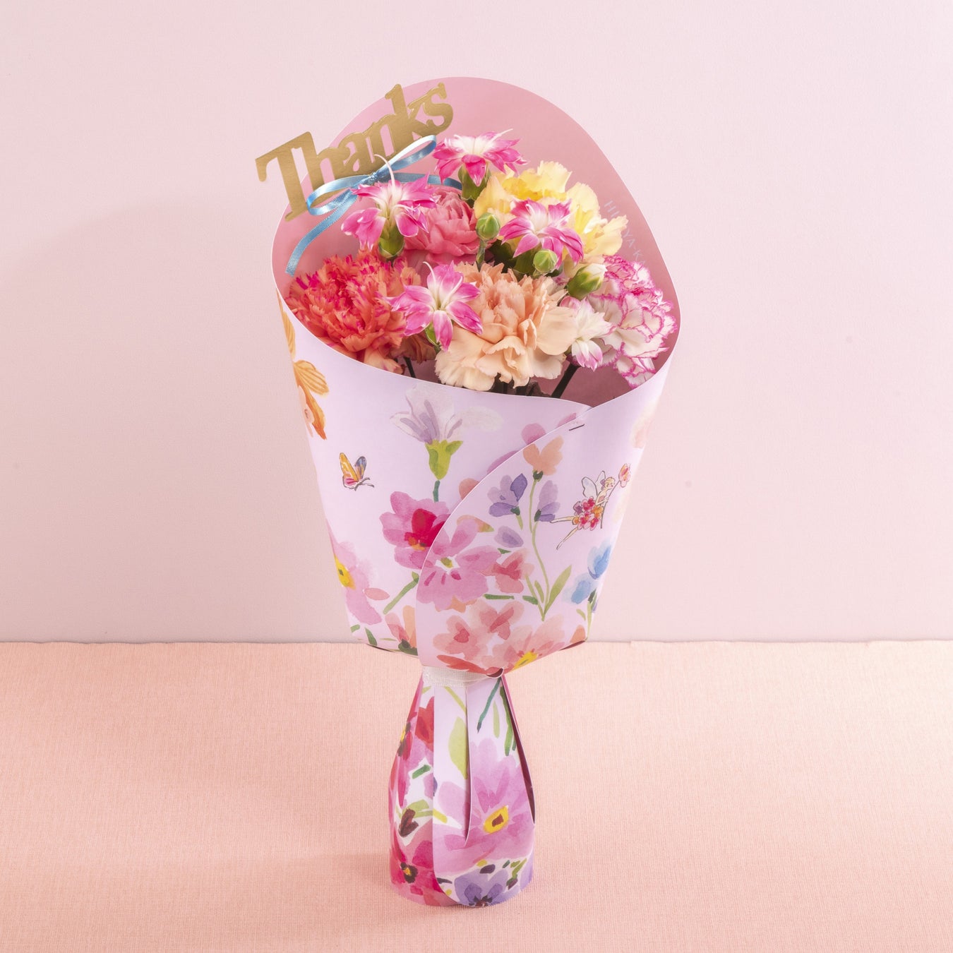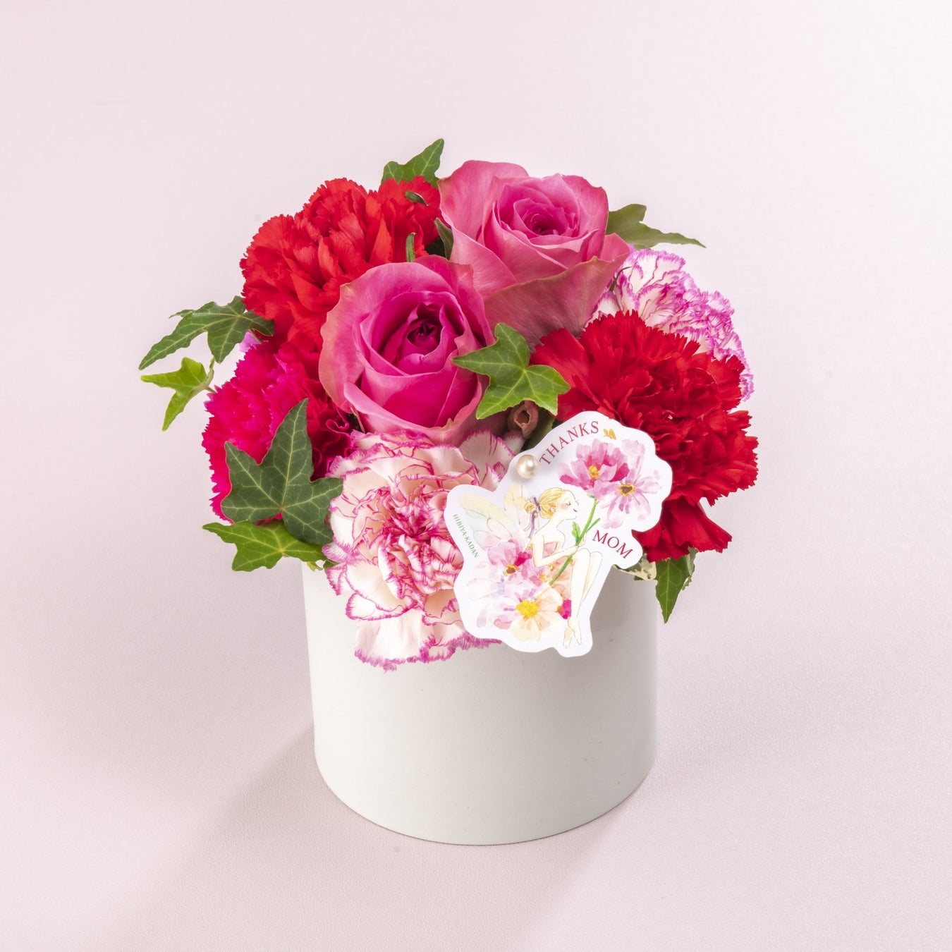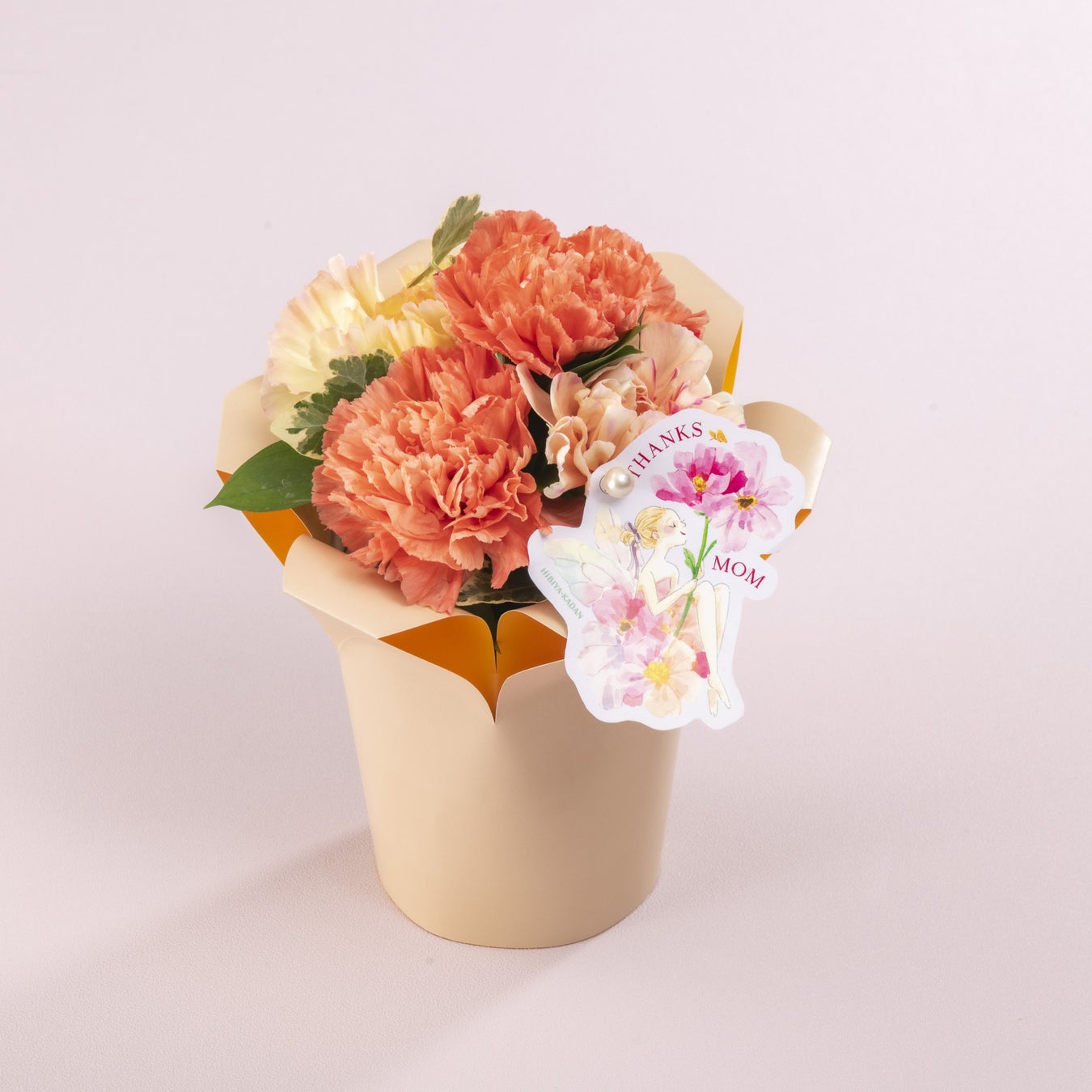 カラフルなカーネーションのブーケに「Thanks」のピックを添えて、お母さんに「ありがとう」を届けます。