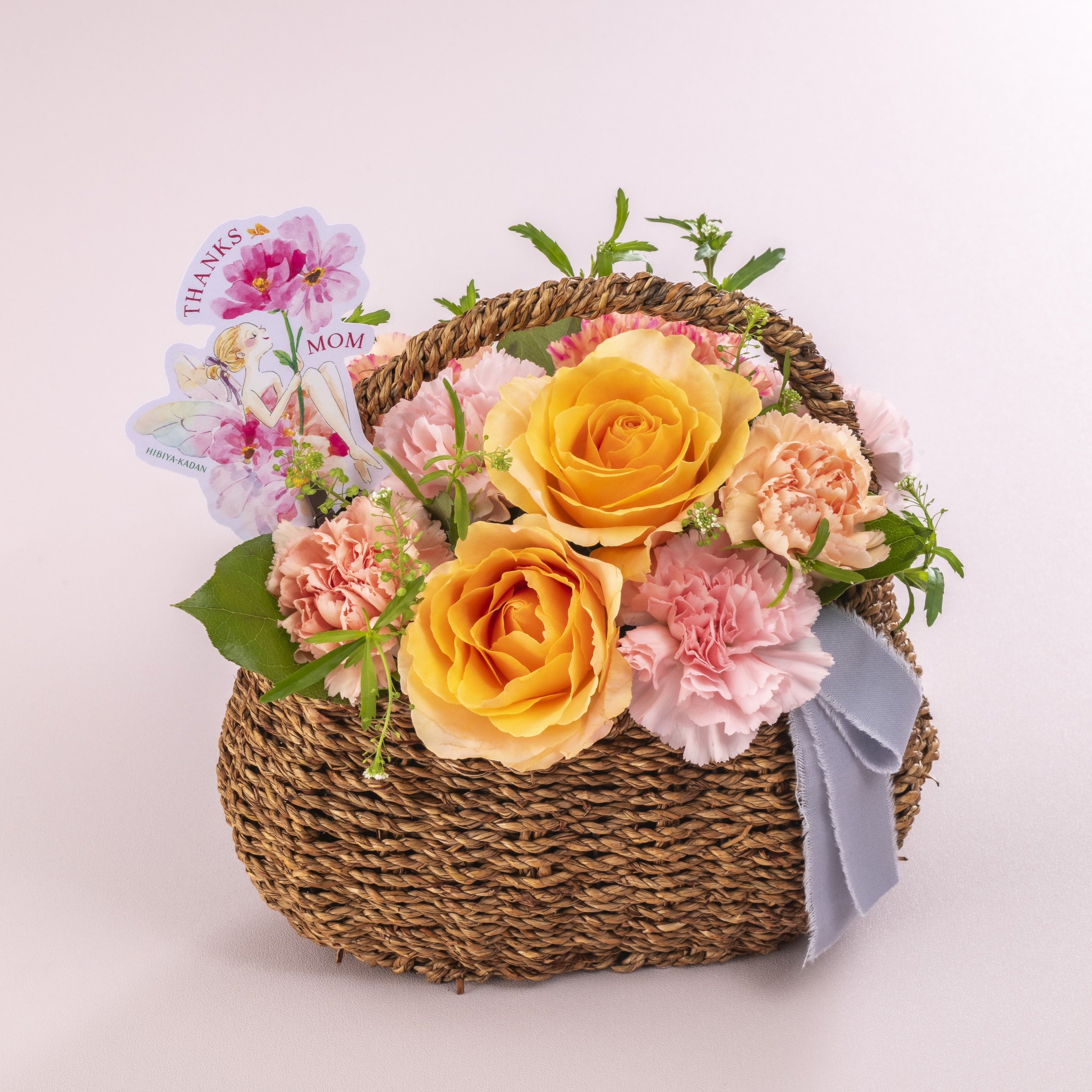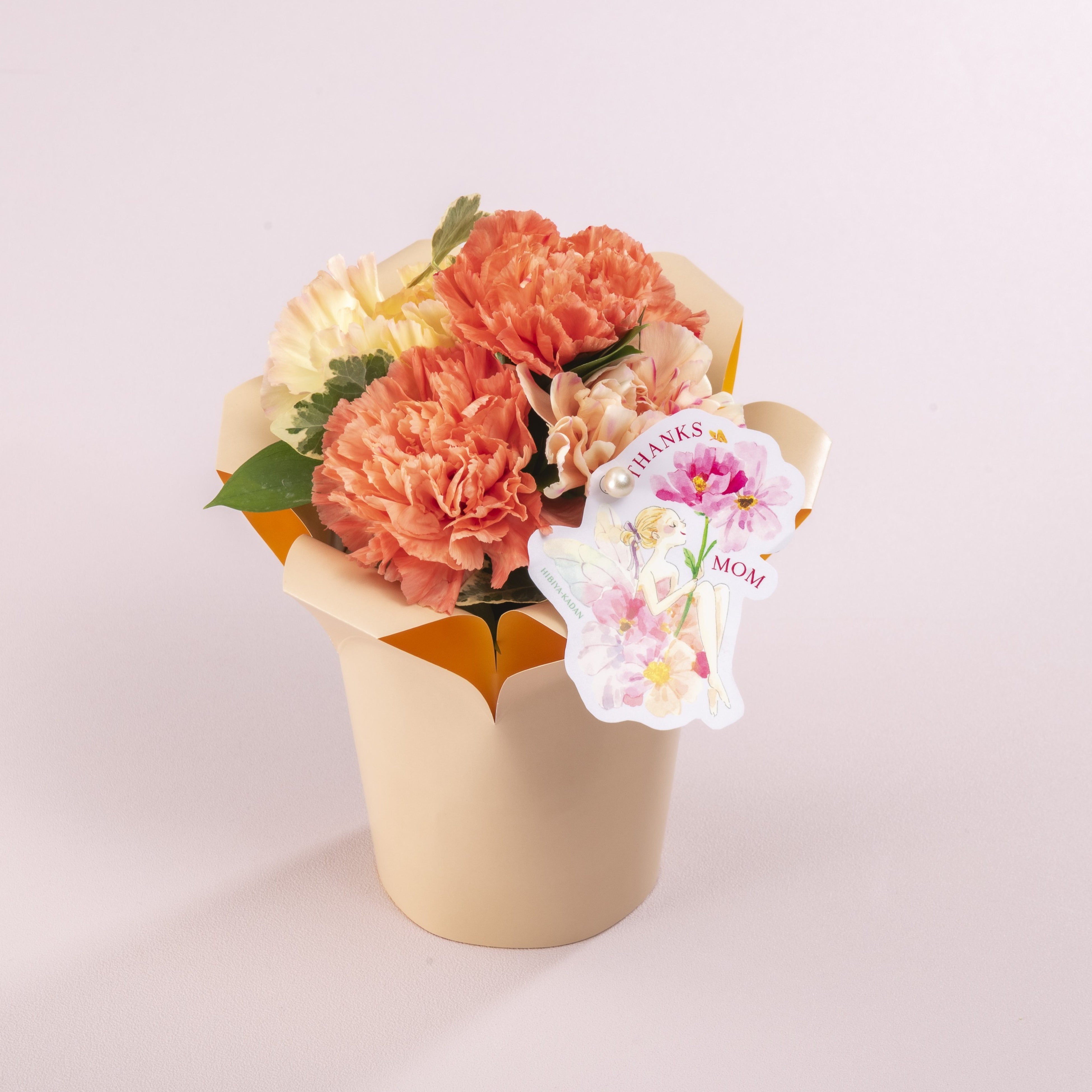 お母さんとの「絆」を深めるオレンジ色の花々をあしらいました。心もお部屋もふわっと明るくなるアレンジメントです。