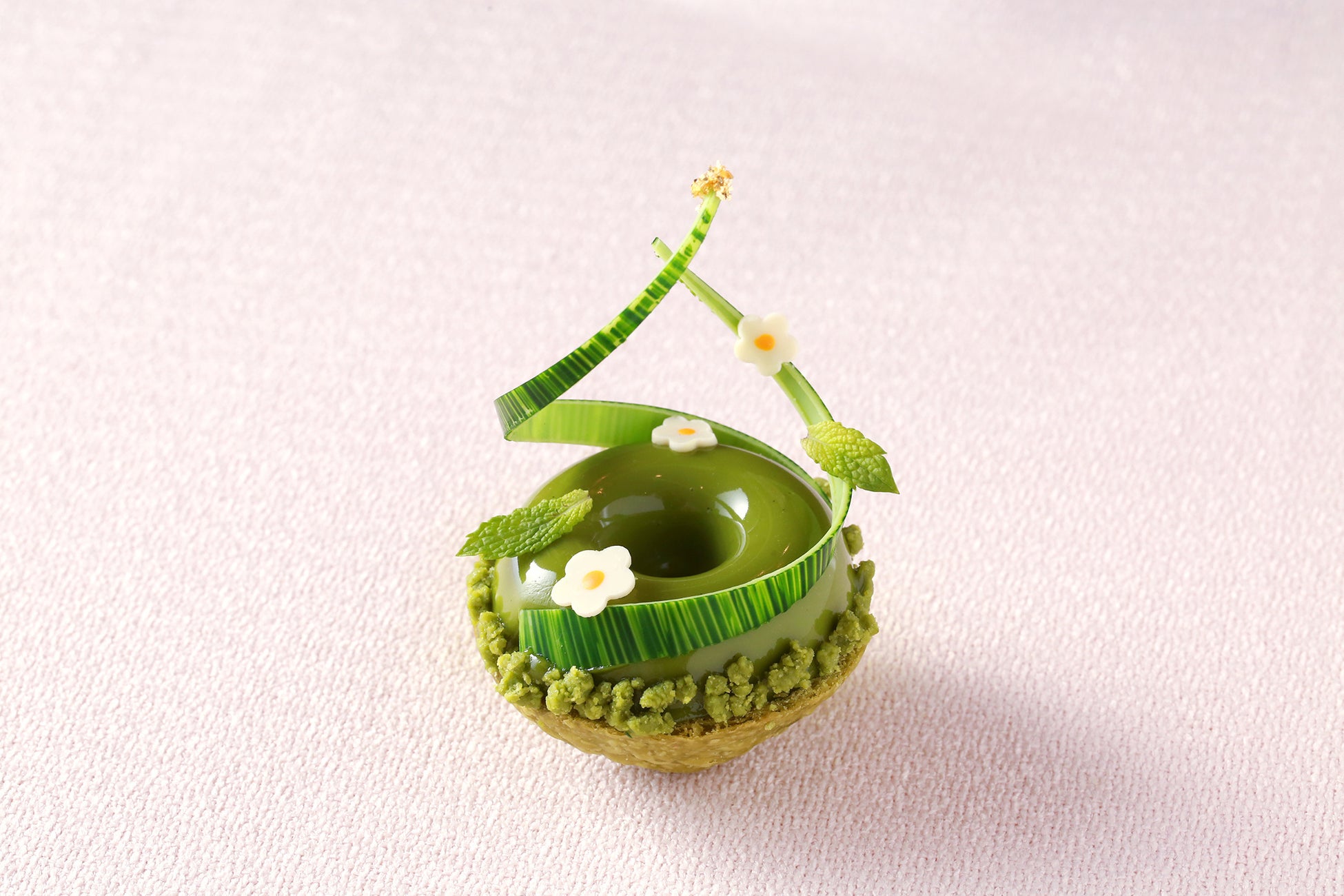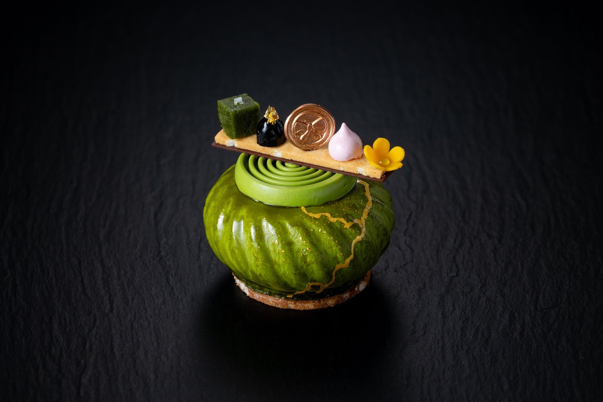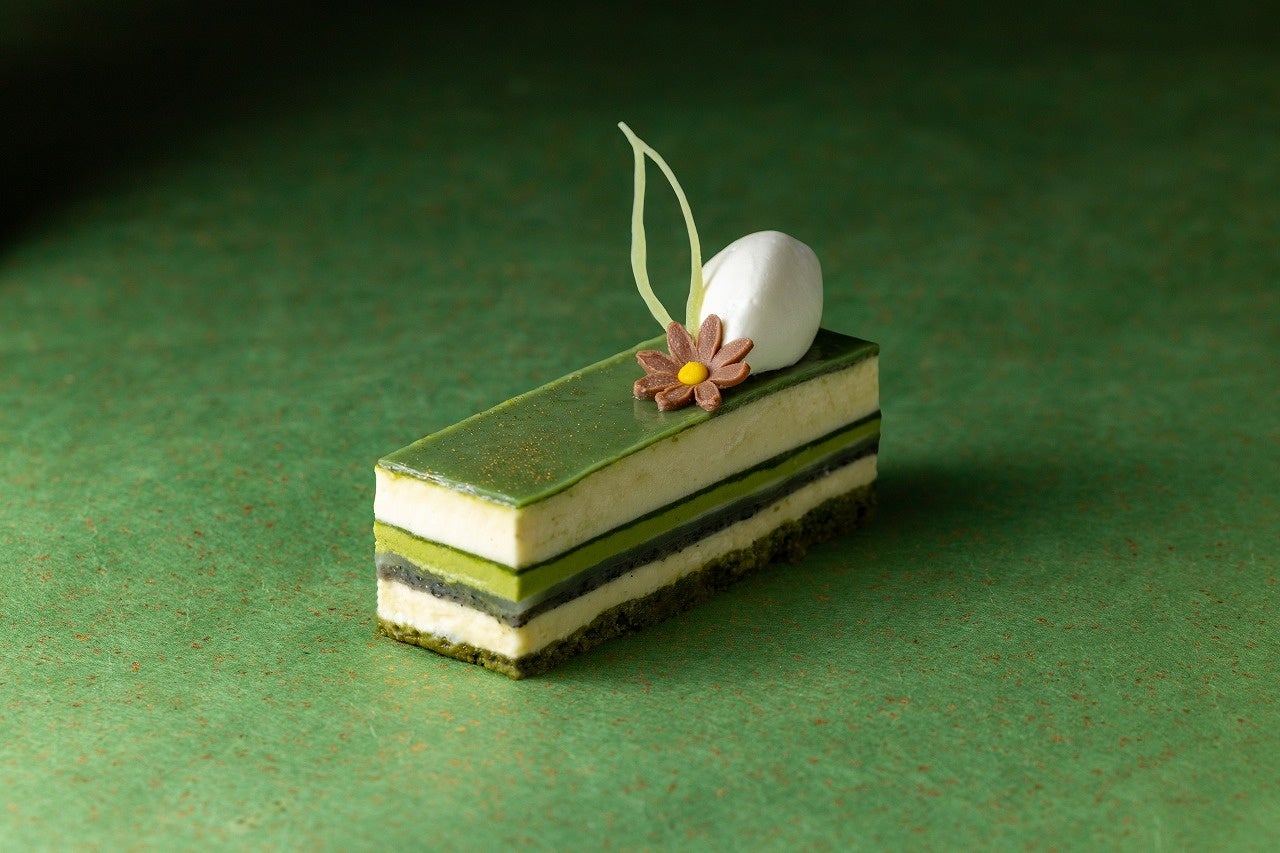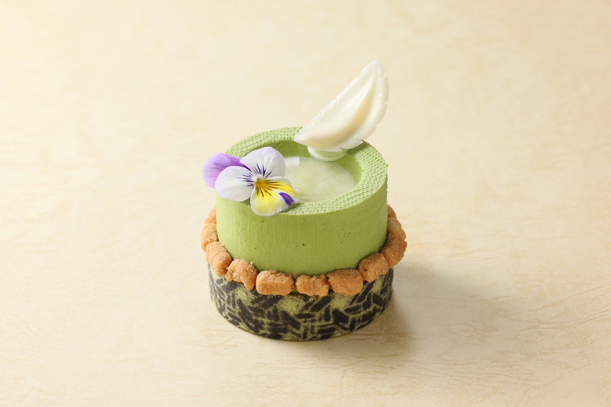 土台部分は金継ぎされた茶碗を表現し、中には抹茶と相性の良い柚子餡をアクセントに、自家製の黒糖京わらびもちをしのばせ、味に深みを加えています。お茶菓子を表現した5種類の飾り菓子をのせて茶道の華やかさを演出しました。また、一人でも多くのお客様に召し上がっていただきたく、生地には米粉を使用しています。一口食べると宇治抹茶本来の芳醇な香りと心地よい苦みが口の中に広がる和菓子のようなケーキを是非ご堪能ください。