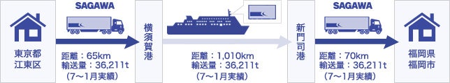 この課題を解決すべく、両社において、宅配便貨物のリードタイム輸送を考慮した上で、港・航路の選定、ターミナルへの到着時間、入出港・航海時間等の協議を重ね、関東-九州間のトラック長距離幹線輸送の一部を、横須賀-新門司航路の海上輸送に切替えるモーダルシフトを実現しました。