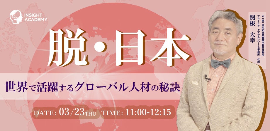 グローバル⼈材育成・研修業を⼿掛けるインサイトアカデミー株式会社(東京都港区、代表取締役:北村嘉章)は、2023年3月23日(木)11時より、無料webセミナー「脱・日本~世界で活躍するグローバル人材の秘訣」を開催します。お申込み受付を開始しました。