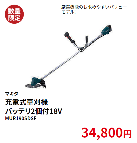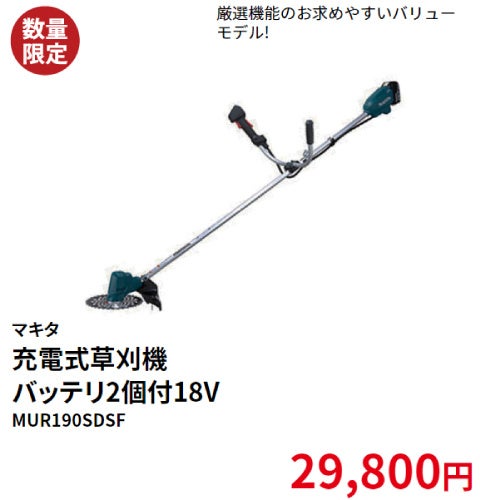 商品名:マキタ 充電式草刈機 バッテリ2個付き18VMUR190SDSF