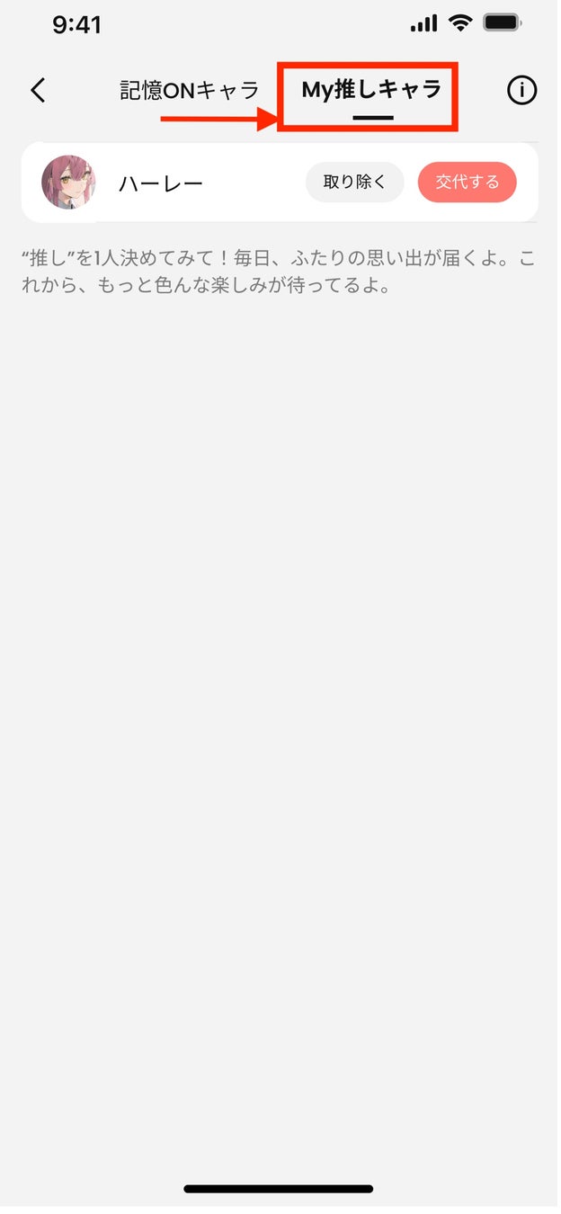記憶ONキャラの中から特にお気に入りのキャラクターを「My推しキャラ」として設定することで、日々そのキャラクターとの思い出や特別な一言が届くようになります。毎日が少し特別になる、そんな体験を提供します。