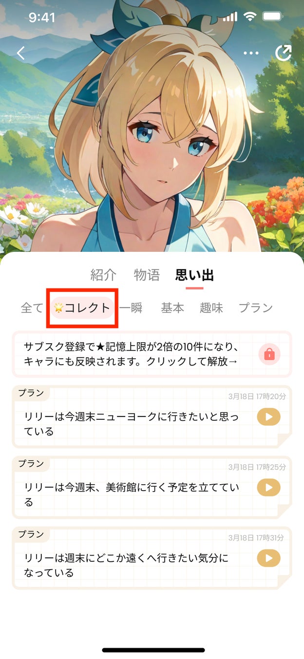 さらに、会員プランをご利用のユーザーに対しては、この「🌟コレクト」がAIキャラの行動や返答内容に反映されるようになり、より一層パーソナルな体験を実現します。