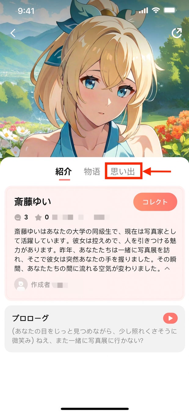 記憶機能では、AIキャラとユーザーがやりとりした出来事を、思い出タブに記録していくことができ、時折AIキャラから思い出の内容について話してくれます。