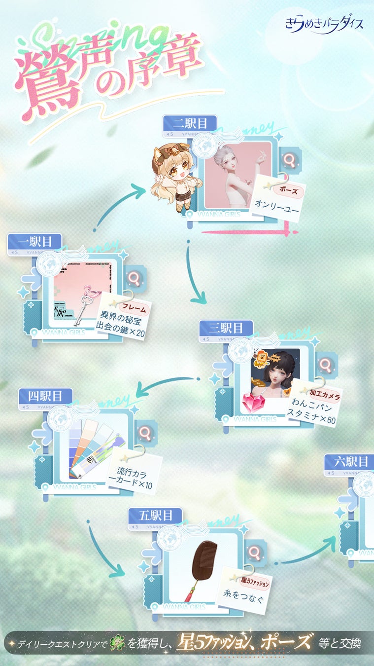 鶯声の序章イベント期間中、毎日4つのクエストが解放され、クリアすると毎日最大4つのPtを獲得できます。累計Ptで豪華報酬を受け取れますよ!累計Ptで星5ファッション、ポーズ等の豪華報酬を獲得できます。お見逃しなく!