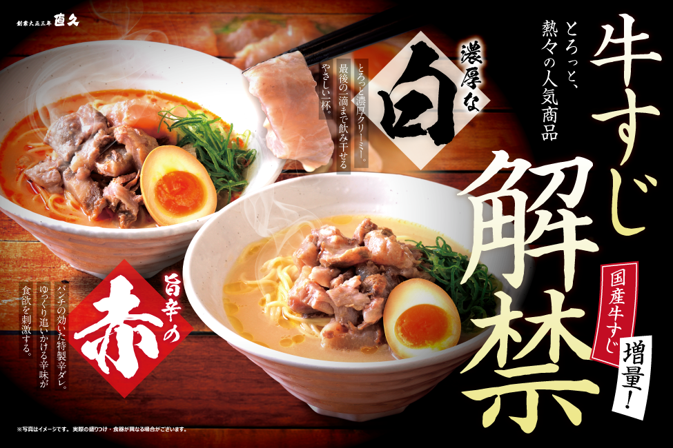 厳選した良質な国産牛すじのみを、丁寧な下処理を施し、さらにじっくりと時間をかけて煮込むことで、やわらかく、ぷるぷるの食感を味わえるように仕立て、こだわりの素材・スープ・麺の三位一体を、今年も直久の「牛すじらーめん」でご賞味いただきたいという想いを込めて、あたたまる一杯をお届けします。