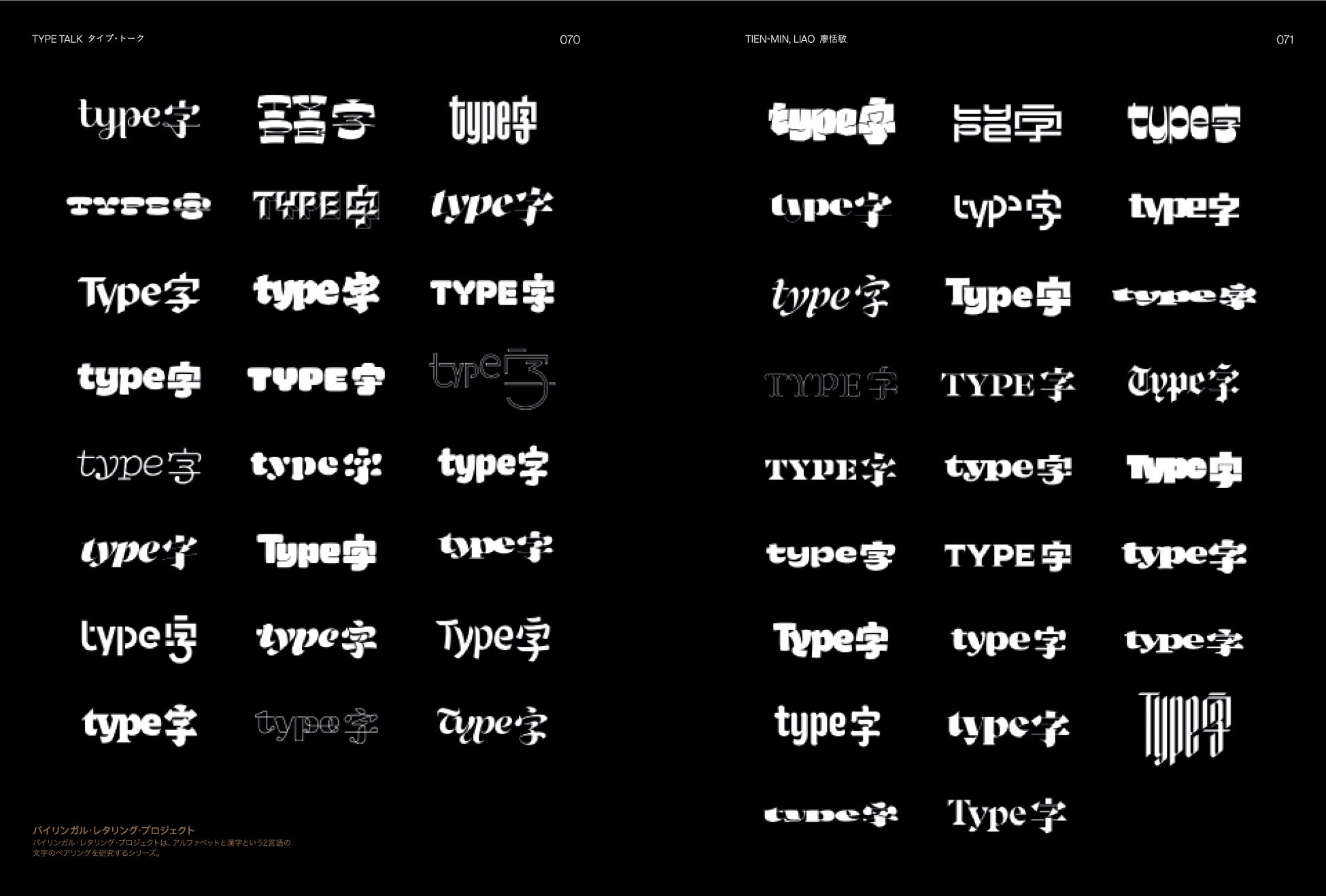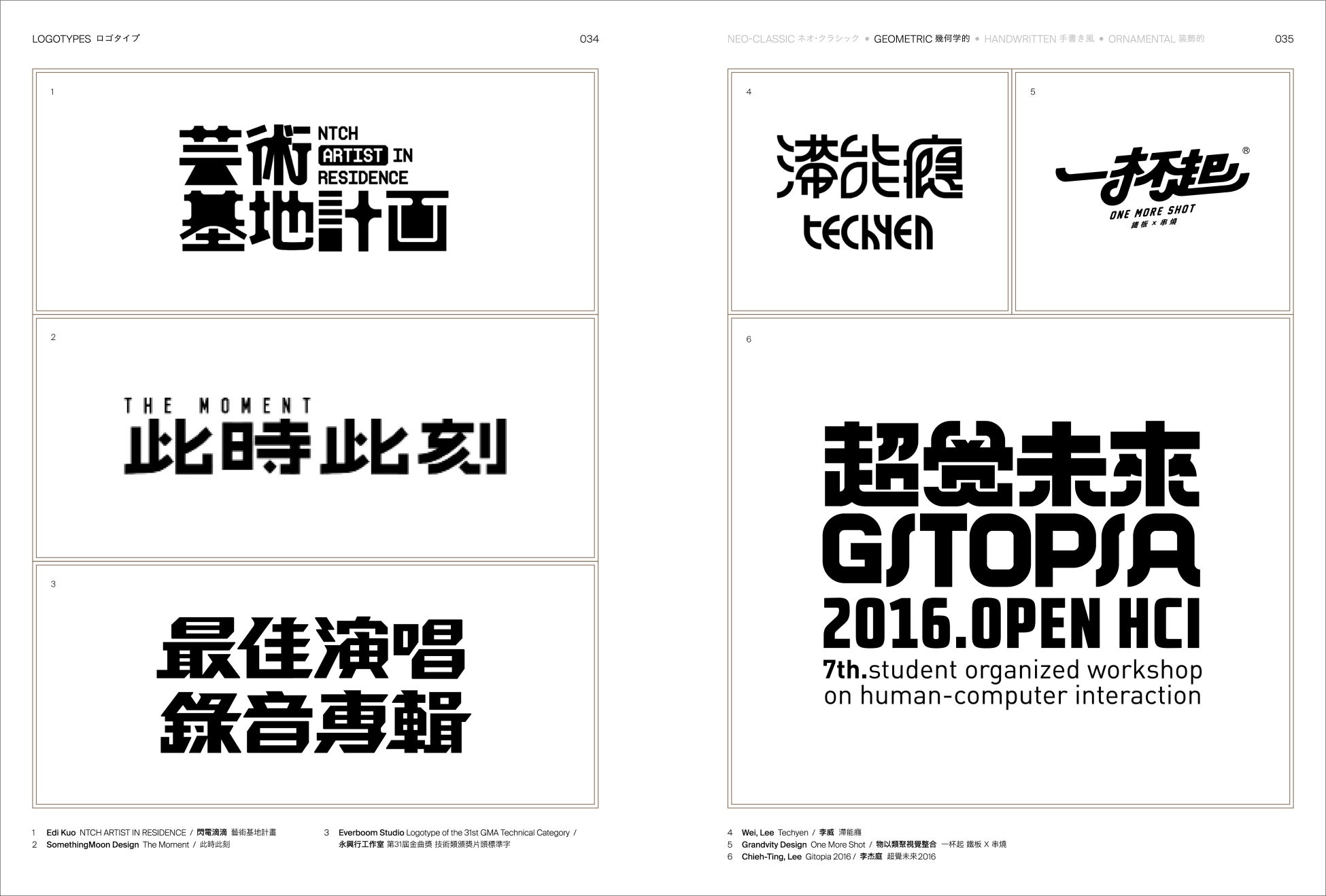 推薦の辞、まえがき、ロゴタイプ(ネオ・クラシック・スタイル、幾何学的スタイル、手書き風スタイル、装飾的スタイル)、タイプ・トーク(Tien-Min Liao、Julius Hui、三重野龍、justfont)、ショーケース、タイプ・スポットライト、作者略歴・作品クレジット