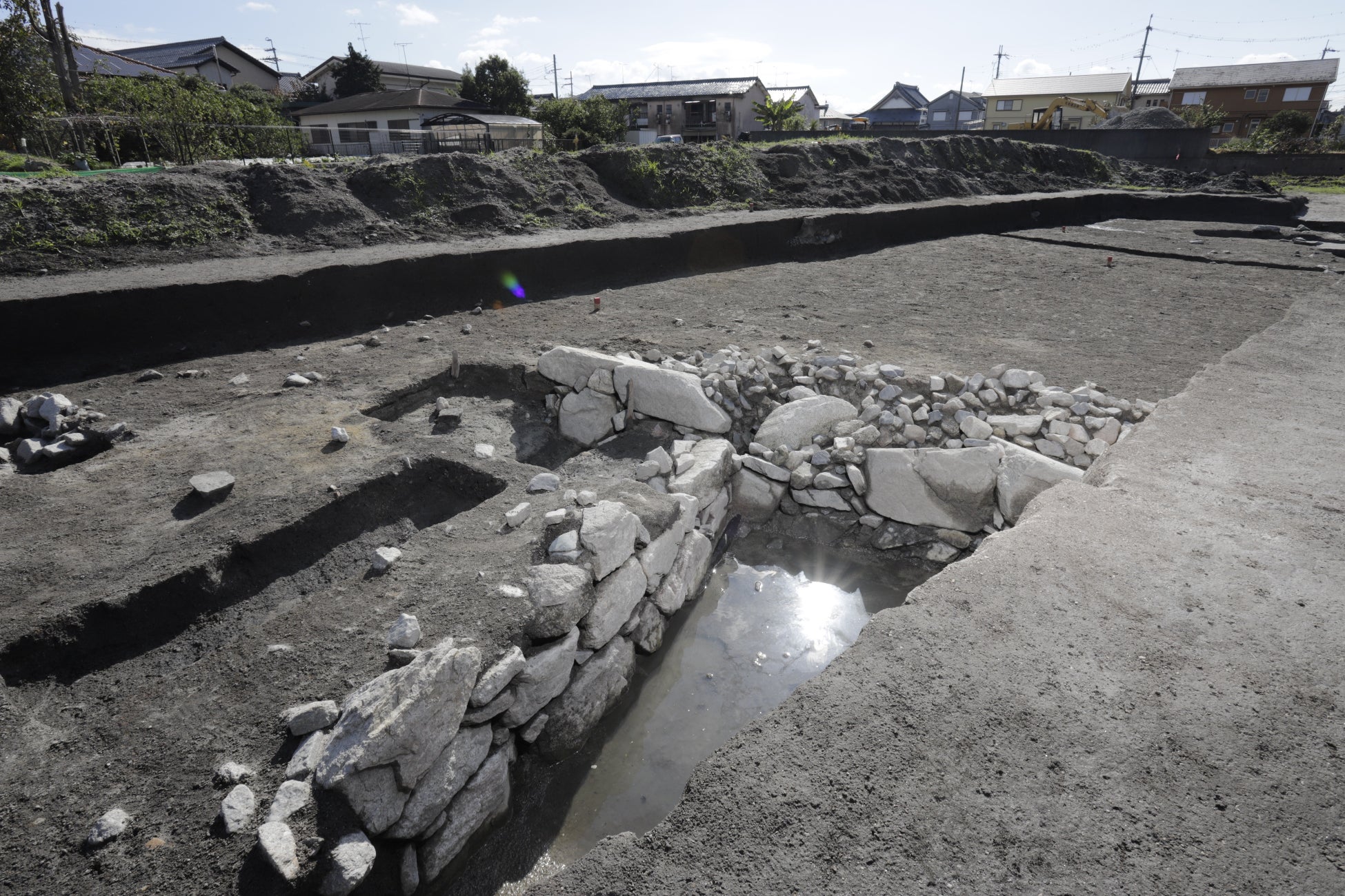 次に坂本城の遺構が確認されたのが、令和5年度に実施した宅地造成に伴う発掘調査です。その調査では、長さ30mを超える石垣を有する堀や礎石建物等が確認され、出土遺物等から坂本城の外郭(三ノ丸)の遺構であると判断しました。現地説明会を行ったところ、全国から2000名以上の参加があり、遺構の重要性から開発事業者との協議の結果、遺構を現地保存し、国史跡指定を目指す覚書を締結しました。