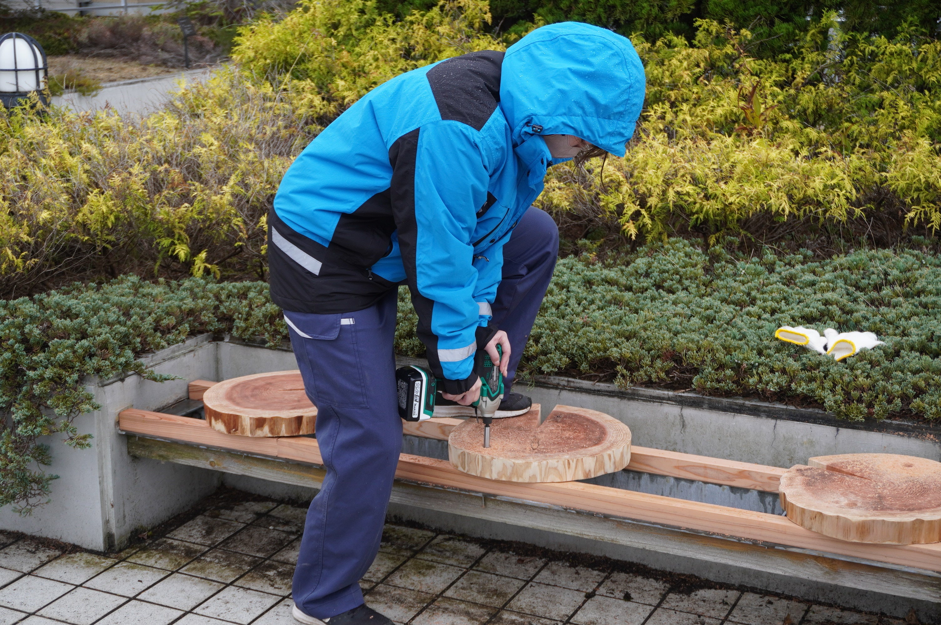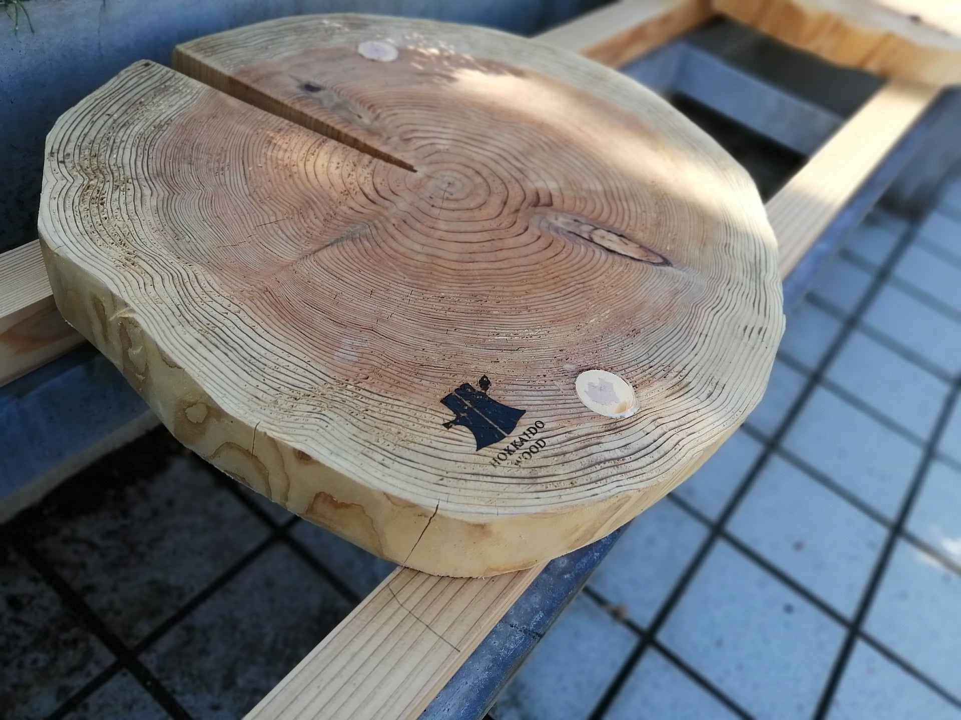 設置後、道産木材を活用したことをPRするため、「HOKKAIDO WOOD」のロゴマークの焼印を押し15台のベンチを完成させました。
