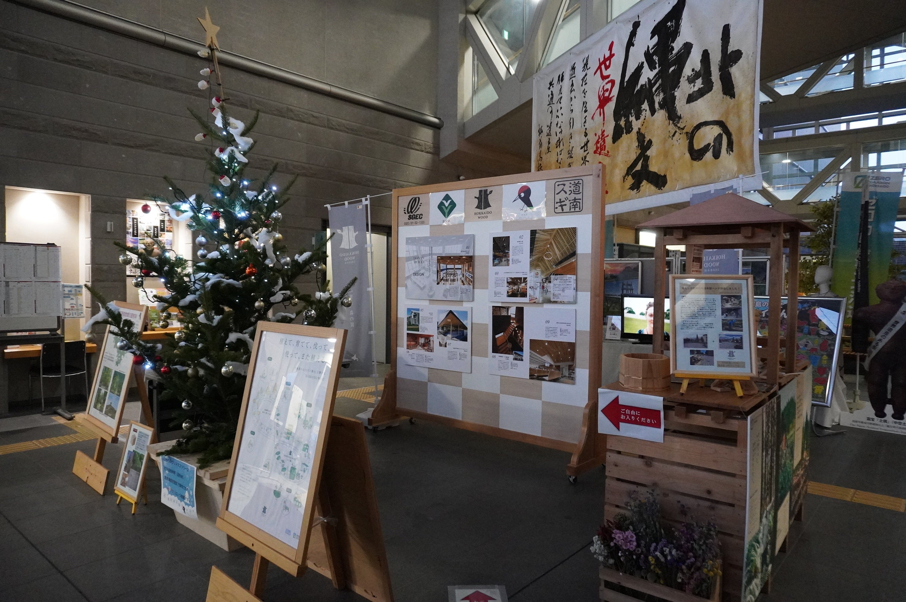 また、ツリー設置に併せて、林業・木材産業の理解促進を図るため、道有林の紹介や道産木材の利用等の普及啓発パネルと地域材で製作した屋台等を展示しています。