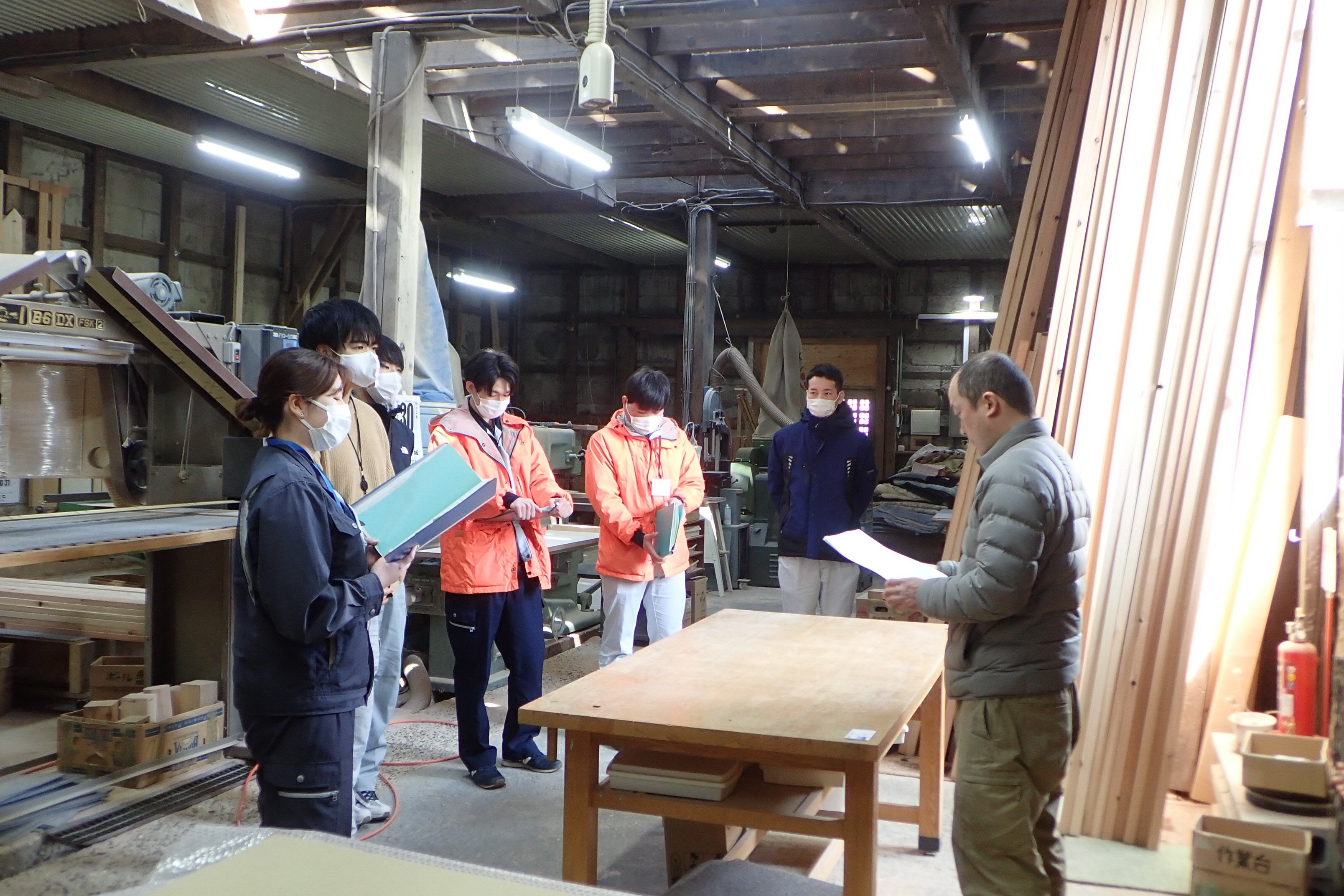 改修に向け、地域の木材関連企業2社にご協力をいただき、アイデアや設計の問題を解決する機会を設けました。製材業者からは、地域の木材の魅力を発信する経営理念、木1本を無駄なく使用する精神を学び、家具製作業者では、円盤の割れを防ぐための加工技術等を教えていただきました。