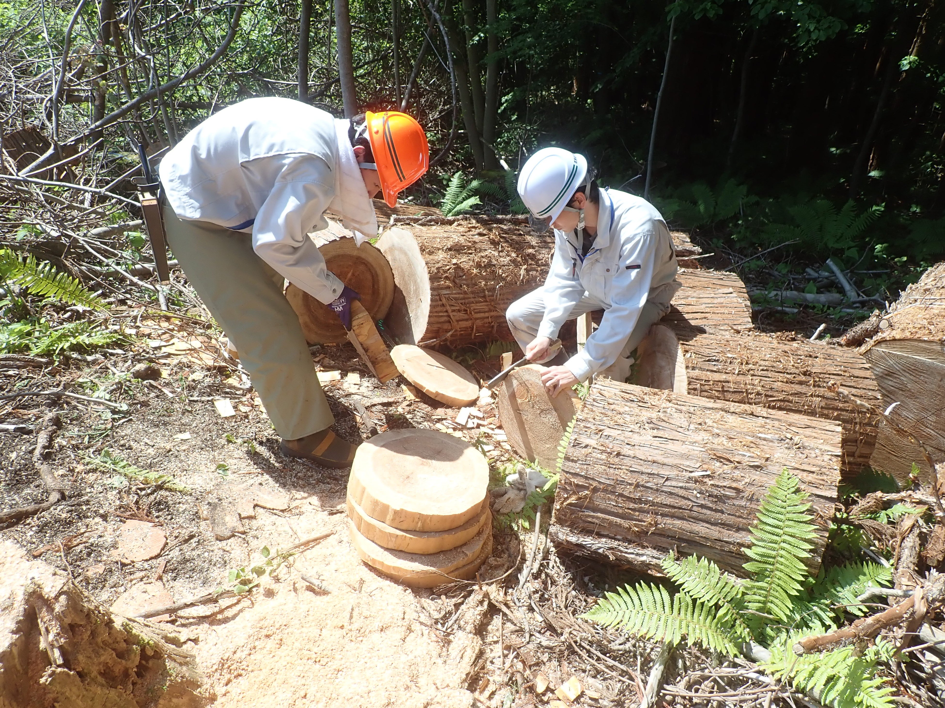 座面となる丸太を輪切りにした円盤は、造材時に山へ放置される林地未利用材からチェーンソーで切り出し調達しました。