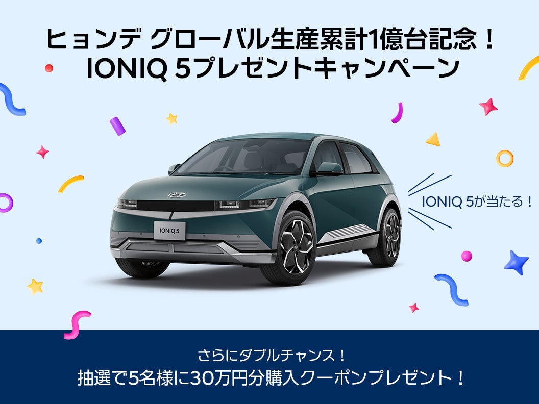 Hyundai Mobility Japan株式会社(本社:神奈川県横浜市西区、代表取締役社長:趙源祥、以下Hyundai)は、 Hyundai Motor Companyが創立57年で累計自動車生産1億台の達成したことを記念し、抽選で1名様に「IONIQ 5(アイオニック ファイブ)」が当たる「ヒョンデ グローバル生産累計1億台記念!IONIQ 5プレゼントキャンペーン」をはじめ、日頃から支えていただいているお客様への感謝の気持ちを込めた特別プレゼント企画を実施いたします。