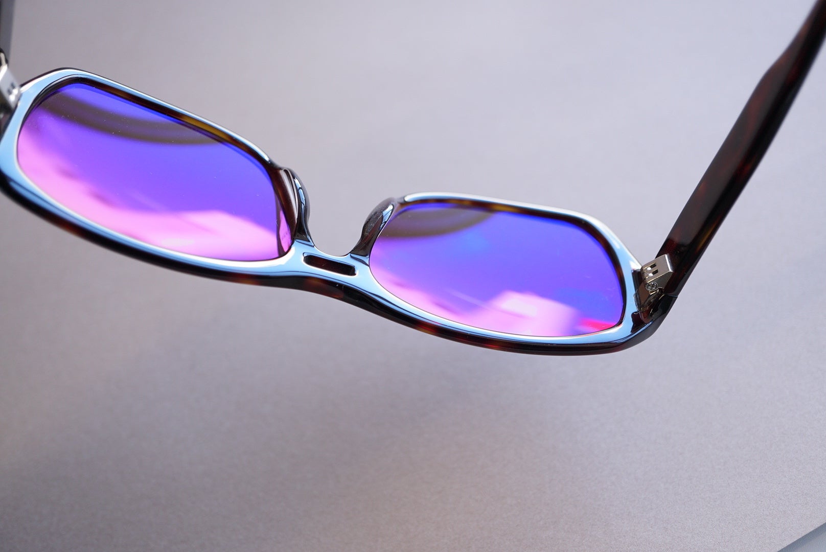 バイカーズシェイプ。80年代を意識したオールドスタイルで、フレーム裏のべっ甲柄やマーブル柄がアクセント。
