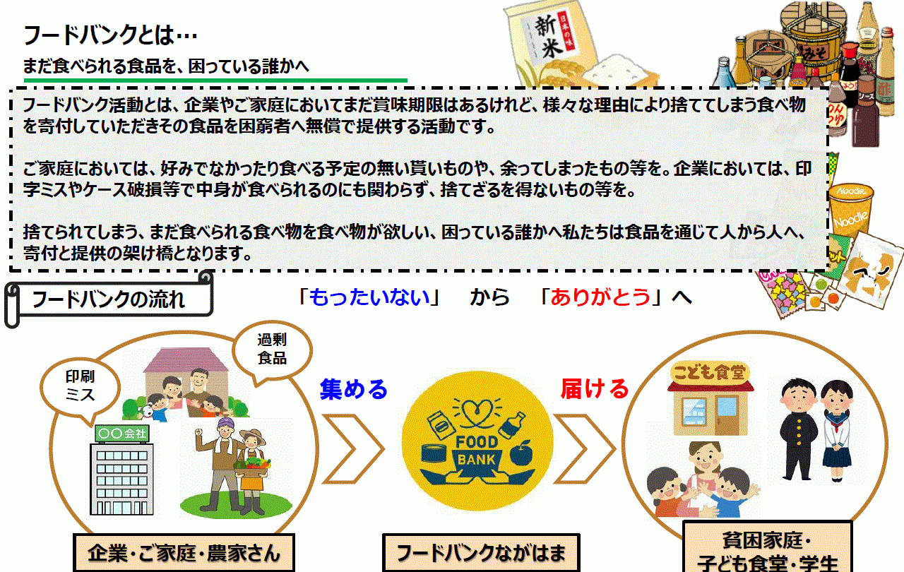 平和堂は、かねてより商品の廃棄削減や適量販売などによる食品ロス削減に取り組んでおり、サステナブルな社会の実現へ向けた様々な活動を実施しています。今回の取組みは、フードバンクながはまが平和堂の店頭でフードドライブを実施するものです。皆様からご提供いただく食品は、フードバンクながはまを通じて、食品を必要としておられる方々のためにご活用いただきます。