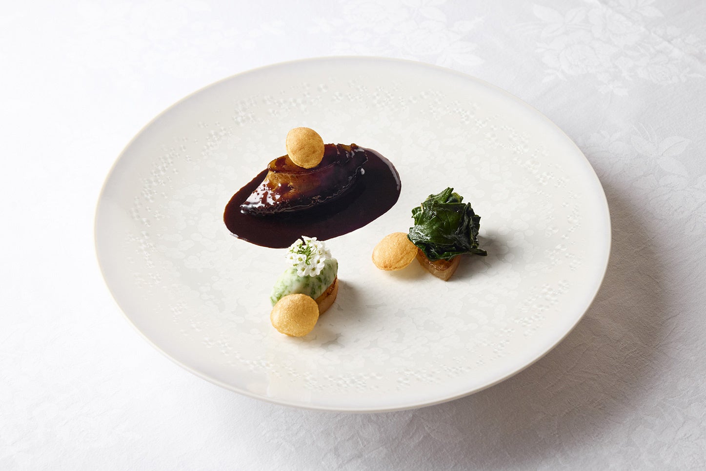 一般的にジビエを使うシヴェ(ジビエを用いた赤ワイン煮込み)を、珍しく蝦夷鮑で仕立てた一品。肉厚な鮑をエスカルゴバターでソテーし、鮑の出汁や肝、八丁味噌を使った赤ワインソースで仕上げています。磯の香りが広がる「海苔とゆり根のピューレ」と、「ちぢみほうれん草と大根」の付け合わせが鮑の旨味を引き立てます。さらに、アクセントとして軽やかな食感が楽しめるポムスフレを添えています。
