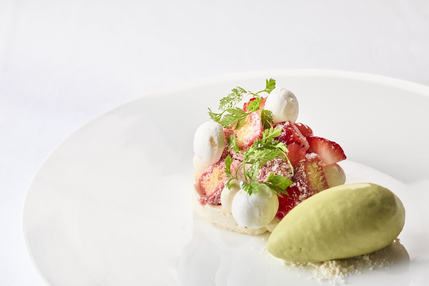 濃厚なバニラクリームの土台に、みずみずしいフレッシュの苺や、ココナッツパウダーをまとった「ラミントン」というスポンジ生地のお菓子を重ねて"クリスマスケーキ"に見立てた可愛らしいデザートです。まろやかな宇治抹茶のジェラートが全体に奥行きを与えます。
