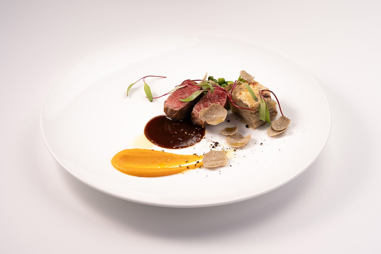 あっさりとした上品な旨味のヒレ肉をパイ生地で包み、焼き上げたウェリントンを「オーベルジュ・ド・リル」のスタイルで仕上げた一品。サクサクのパイ生地の中には、フォアグラと鶏肉を使った濃厚なカフェ・ド・パリ・バターのムースと、キャベツに包まれたヒレ肉が詰め込まれています。仕上げに、芳醇なトリュフを使ったソース・ペリグーを添え、サラダにもトリュフを使用した贅沢なメインディッシュです。