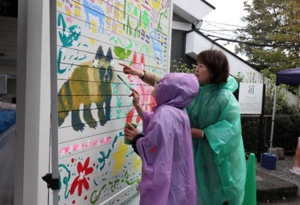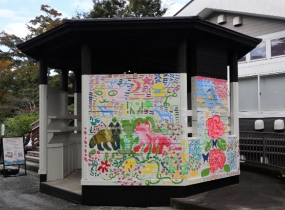 箱根強羅公園(箱根登山線 強羅駅徒歩5分)は、2024年8月20日に開園110周年を迎え、10月20日に箱根クラフトハウス20周年記念として、併設する東屋の壁面に小田原の福祉事業所「アール・ド・ヴィーヴル」のアーティストたちによるライブペインティングを行いました。「箱根の自然と楽しい仲間たち」をテーマに、色彩感覚に富んだ豊かな表現力でハコネバラなどの植物や動物をダイナミックに描き、公園に新たな彩りが加わりました。東屋ではクラフトハウスの作品を展示・販売しており、クラフト体験でアートに触れて、素敵なお土産探しをお楽しみください。