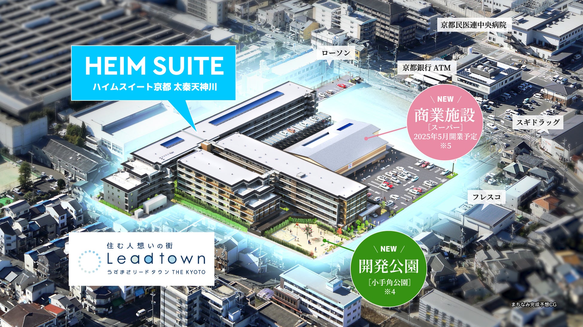 今回開発する『うずまさリードタウン THE KYOTO』は、関西で第一弾となるまちづくりプロジェクトです。地球環境に配慮したZEHマンション(※3)『ハイムスイート京都 太秦天神川』(全183戸、2026年7月末竣工予定)と公園(※4)を一体開発し、災害に強いインフラ設備やスマートサービスを実装。利便性を高める商業施設(※5)もタウン内に併設し、安心で快適、便利な暮らしを叶えるサステナブルなまちの実現を目指します。