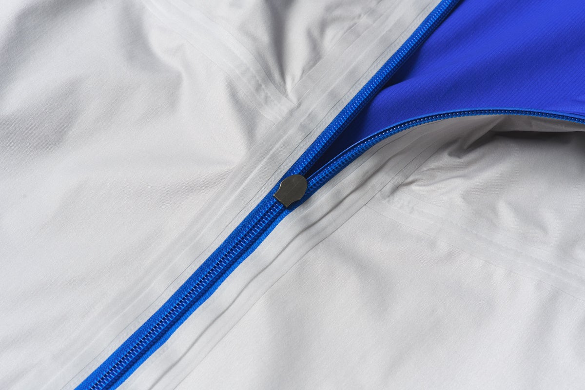 左右のテープが密着することで水の浸入を防ぐ仕様で耐水性をもった止水ファスナーが実現。また、レインウエアに必要不可欠だったフラップが不要になり、ファスナー周りの設計がよりシンプルになりました。
