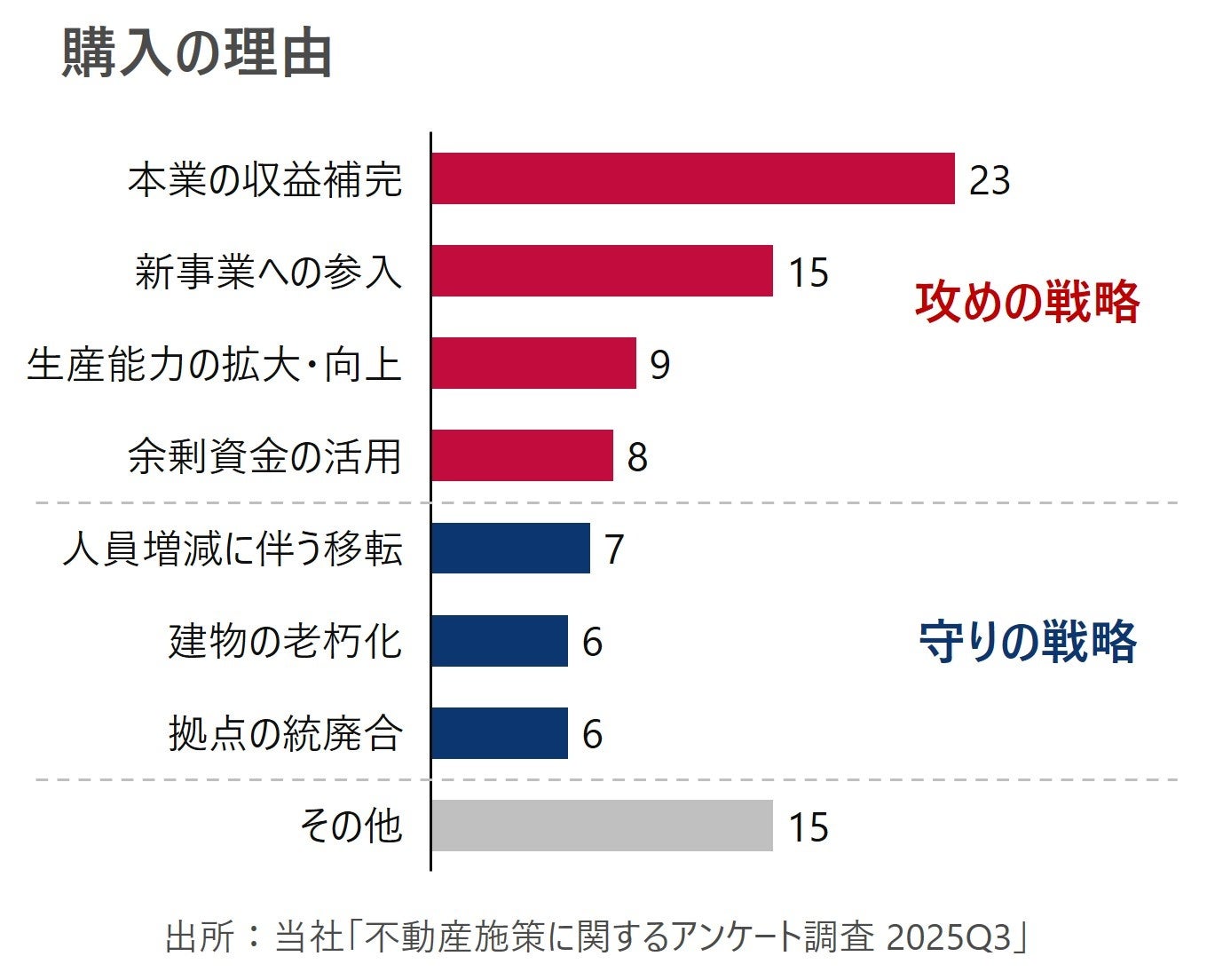 購入の主な理由として「本業の収益補完」や「新事業への参入」が上位を占めた。事業環境が変化する中で、単なる自社拠点の維持・移転にとどまらず、新たな収益源の確保という要素が見て取れる。