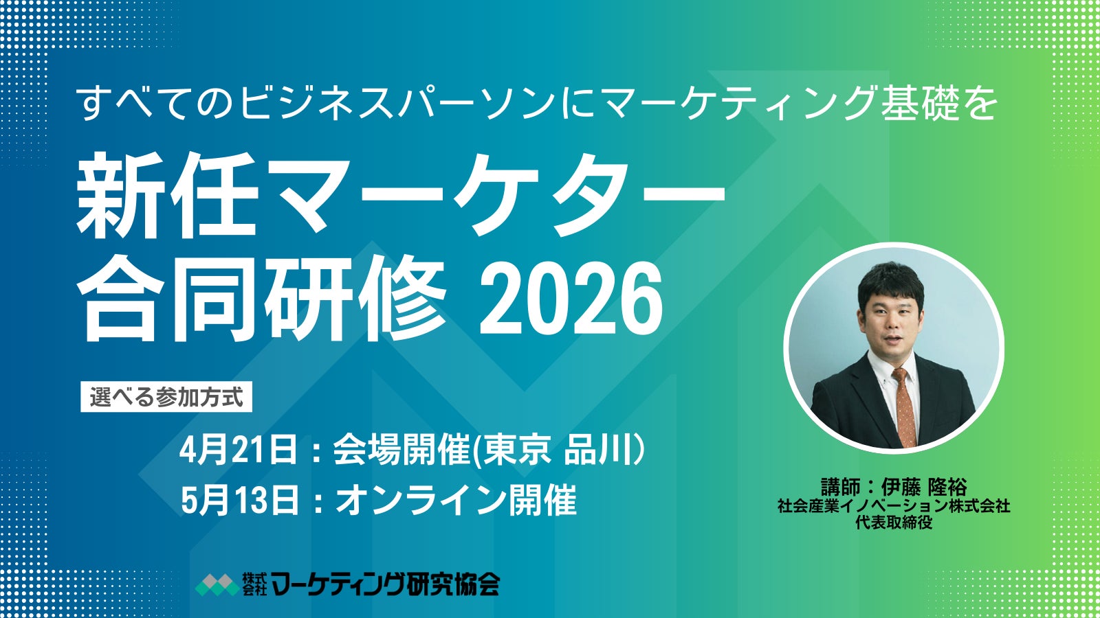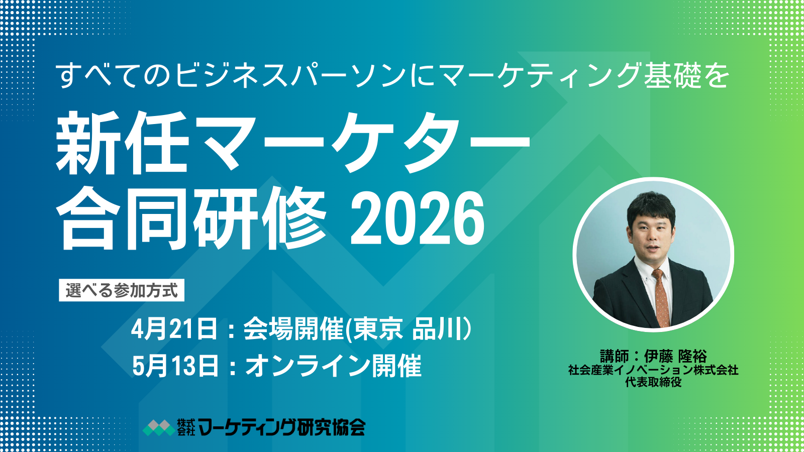 4月21日と5月13日に、「新任マーケター合同研修2026」を開催します。新しくマーケティングにかかわる部門に着任された方、基礎をおさえたい方、マーケティング思考を向上させたい営業の方へおすすめです。