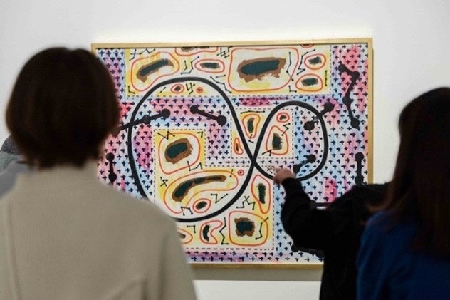 全盲の美術家・光島貴之と、「関係」をテーマに制作を続ける美術家・河口龍夫が、互いの作品を鑑賞し、対話する様子を記録した映像を展示します。