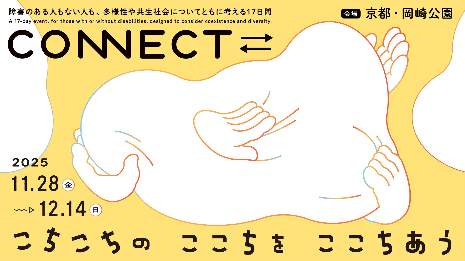 文化庁・京都新聞では、アートを通して多様性や共生社会のありかたについて、障害のある方もない方も共に考え、語り合い、実践するプロジェクト「CONNECT⇄_(コネクト)~こちこちの ここちを ここちあう~」を、2025年11月28日(金)から12月14日(日)までの期間に開催します。京都の文化ゾーンである岡崎地域の美術館、図書館、劇場、動物園、展示会場などの文化施設が連携して、障害や属性に関わらずさまざまな方が気軽に文化・芸術にアクセスできるプロジェクトを行います。