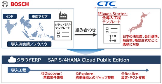 今回の協業では、ボッシュSDSがインドおよび東南アジア地域の製造業向けに展開してきたSAP S/4HANA Cloud Public Editionのテンプレートと、CTCが保有する導入全工程をサポートするテンプレート「Figues Starter」を組み合わせることで、日本の法制度、会計基準、商習慣、帳票形式などに柔軟に対応できるERPの導入や運用を支援します。CTCは、テンプレートの適用からAPI連携、開発、運用までを一貫して行います。標準化された業務プロセスを維持しながら、お客様の特殊要件やAIによるデータ分析にも対応し、拡張性と保守性に優れたERP導入を実現します。