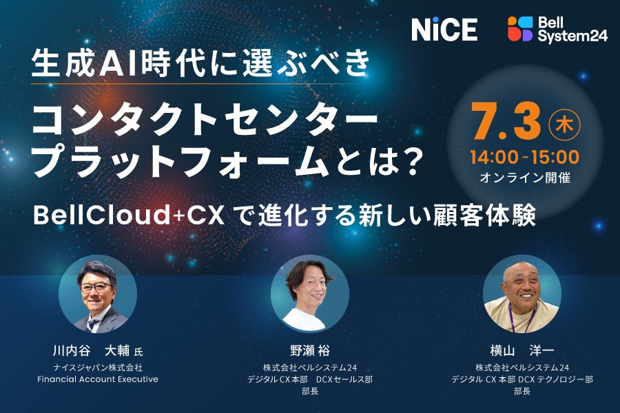 株式会社ベルシステム24(本社:東京都港区、代表取締役 社長執行役員:梶原 浩、以下:ベルシステム24)は、コンタクトセンターを運営する企業向けに、「生成AI時代に選ぶべきコンタクトセンタープラットフォームとは?~BellCloud+CXで進化する新しい顧客体験~」と題したオンラインセミナーを、7月3日(木)に開催します。