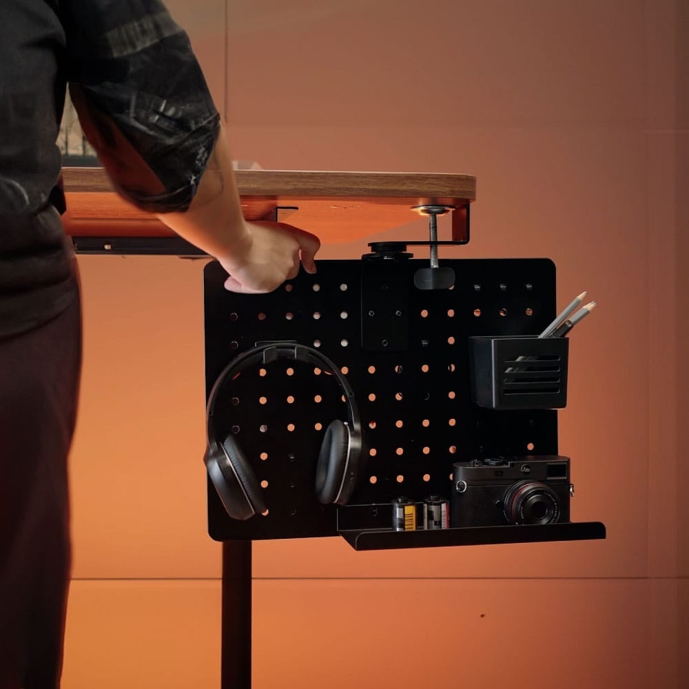 本製品は空間を有効に活用できるクランプ式の回転できる有孔ボードです。