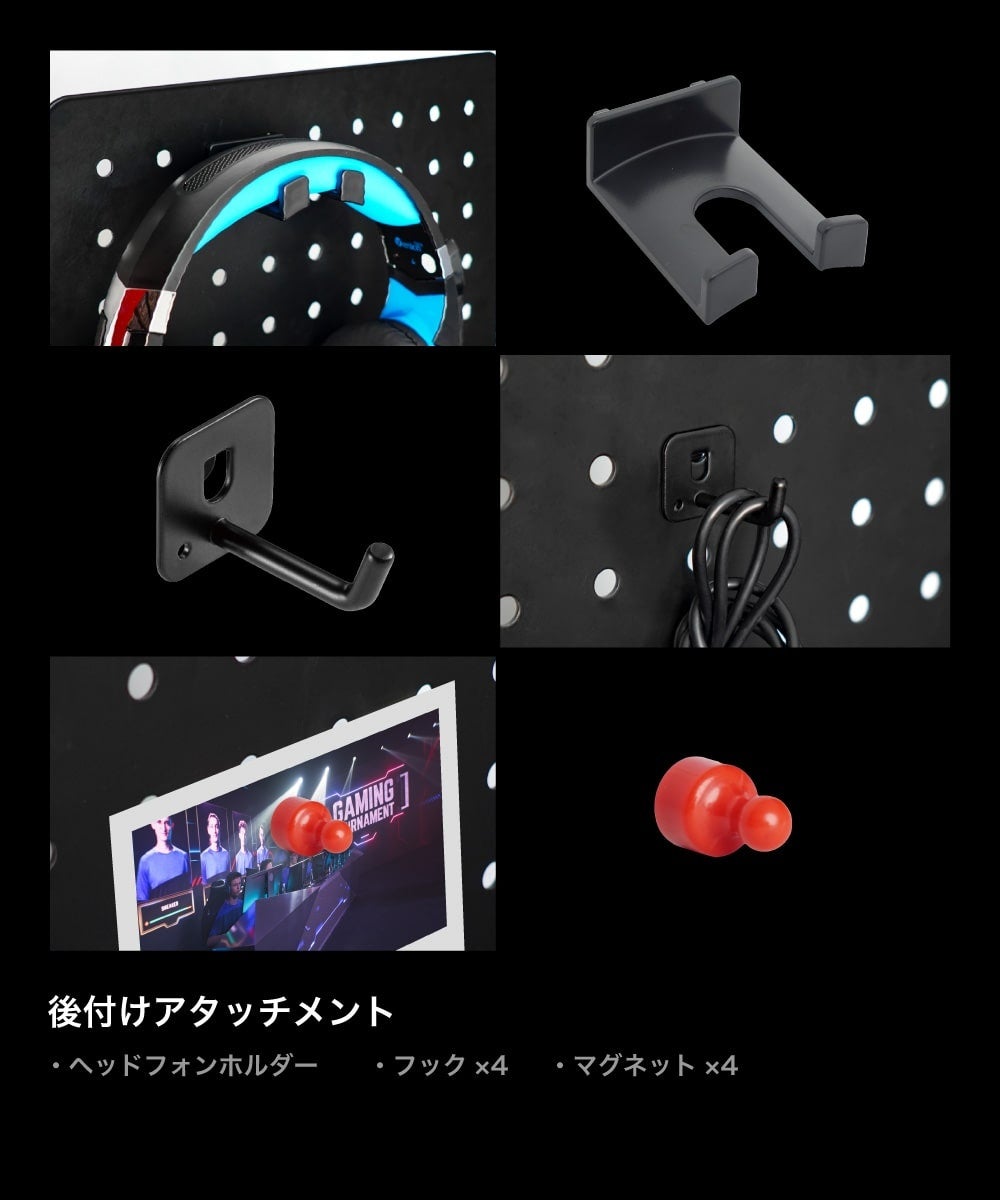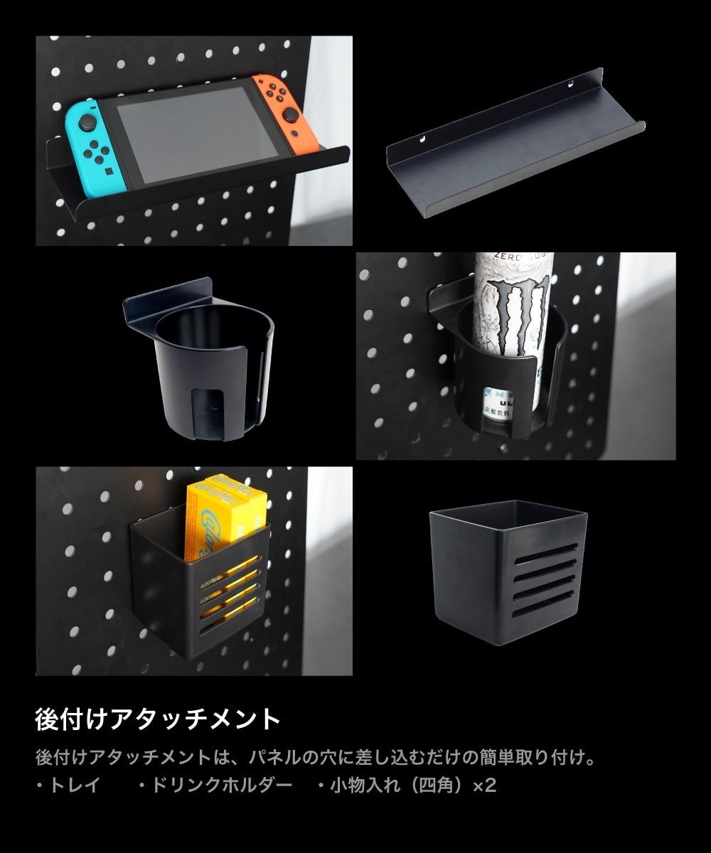 ドリンクホルダー、小物入れ(四角)2点、ヘッドフォンホルダー、マグネット4点が付属。好きな位置にアタッチメントを取り付けて使えます。卓上だけでなく机の下に取り付けも可能。