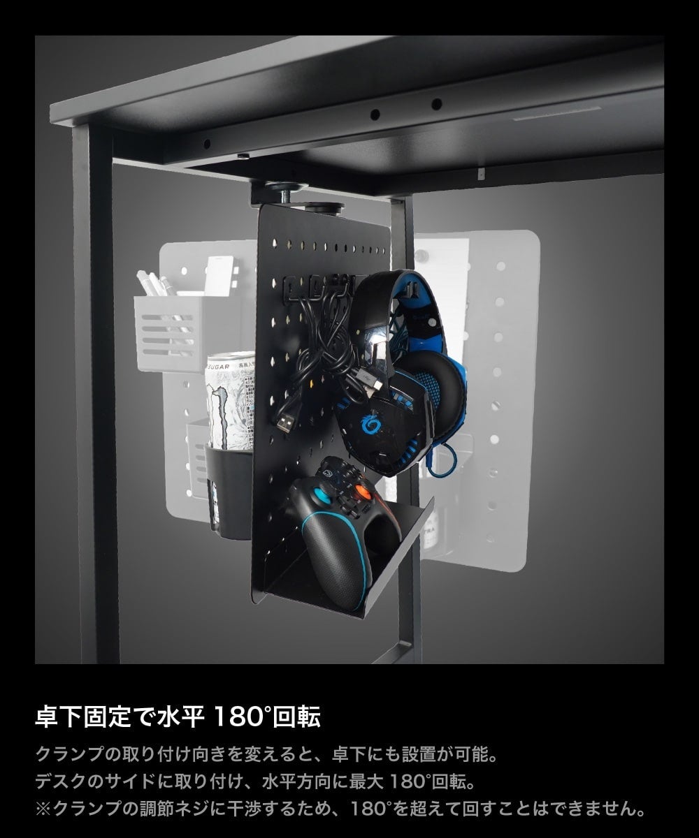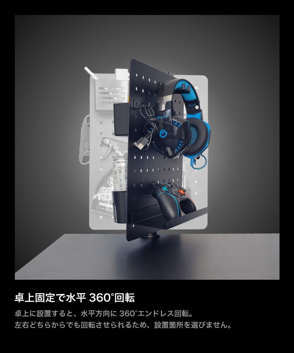サイズは幅32×奥行10×高さ58.5cm。工具不要のクランプ式で手軽に好きな場所にセットができます。穴が開いており付属のアタッチメントを取り付けて空間を有効に活用できます。表側だけでなく裏側にもアタッチメントを取り付け可能。カンタンに360度回転でき、両面が活用できます。