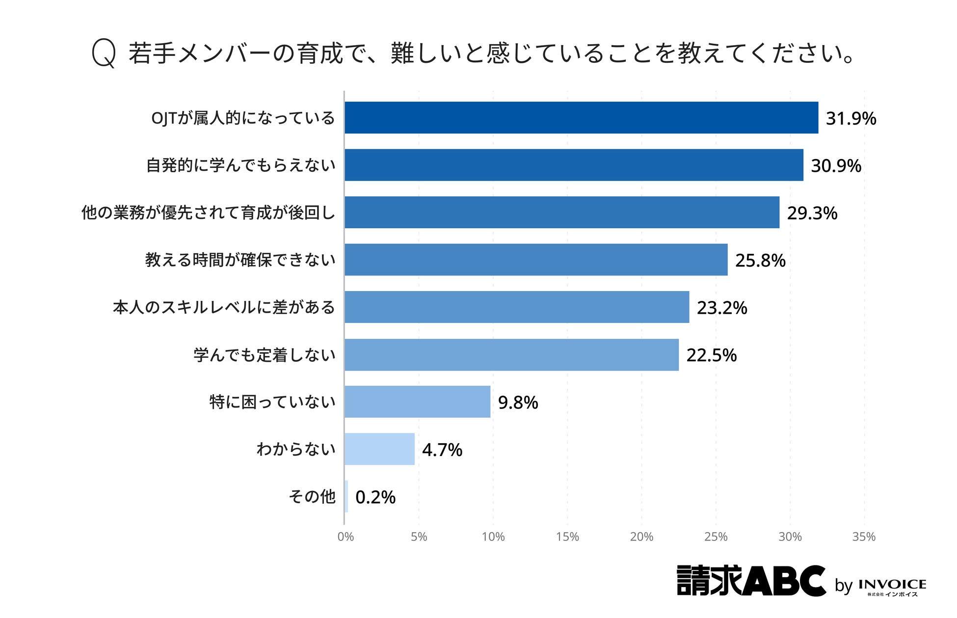 加えて、若手育成で難しいに関する調査では、最も挙げられたのは「OJTが属人的になってい る」(31.9%)であり、指導品質が担当者に依存し、標準化が進まない現状が明らかです。また「自発的に学んでもらえない」(30.9%)や「他の業務が優先されて育成が後回し」(29.3%)など、若手側・指導側双方の環境要因が影響しています。