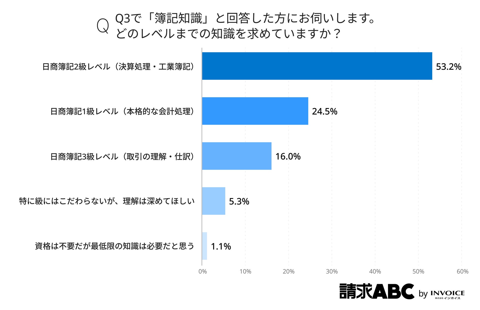 簿記知識が必要であると回答した方に求めるレベル感について調査したところ、上記の通りで最も多かったのは「日商簿記2級レベル(決算処理・工業簿記)」(53.2%)で、実務で必要な決算処理まで理解してほしいという強いニーズが示されています。「日商簿記1級レベル(本格的な会計処理)」(24.5%)も一定数あり、高度な会計判断が求められる場面が増えていることがうかがえます。
