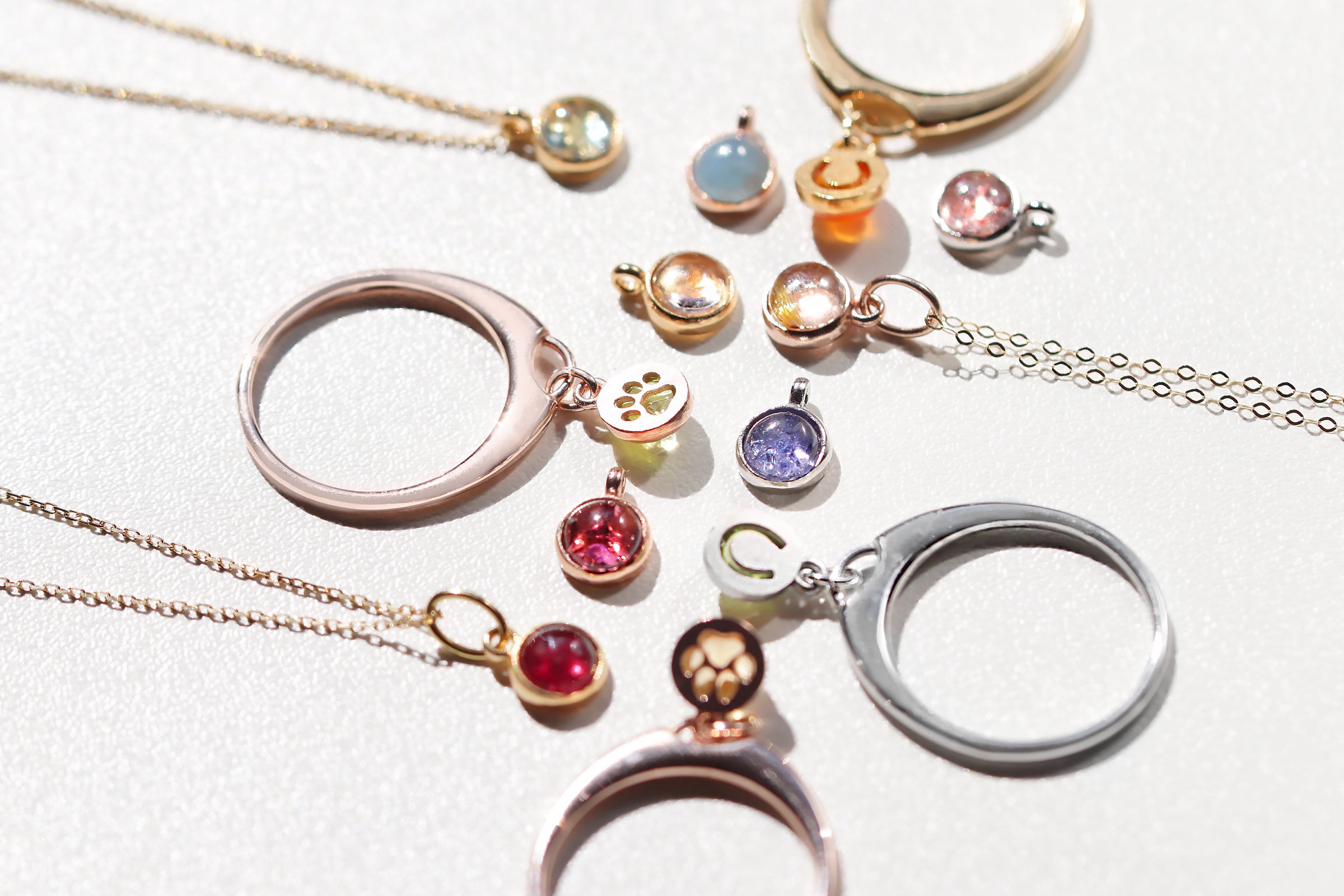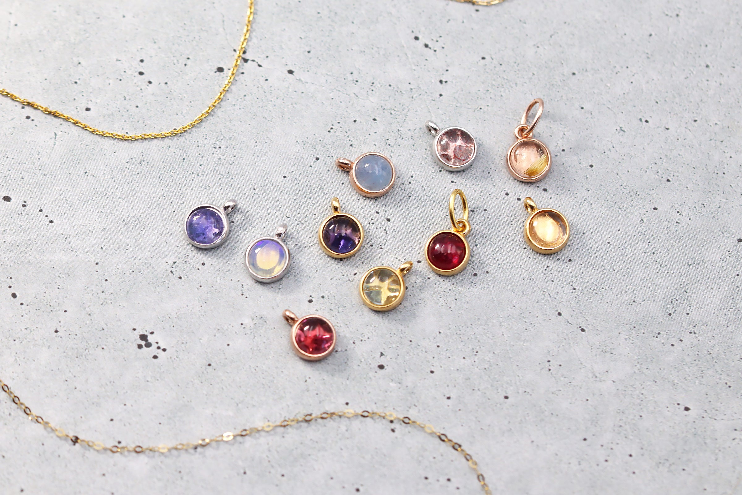 アクアマリン、ムーンストーン、ラピスラズリ、ルビー、タンザナイトなど、世界中の色と輝きを指先サイズに凝縮。