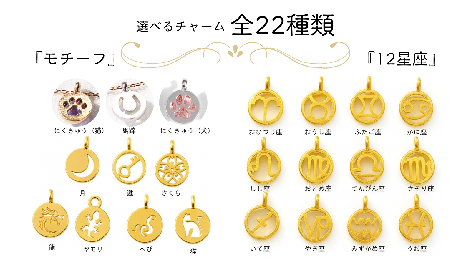 桜、ハート、月、鍵、馬蹄(ばてい)、星座、猫の肉球、龍、ヤモリなど。