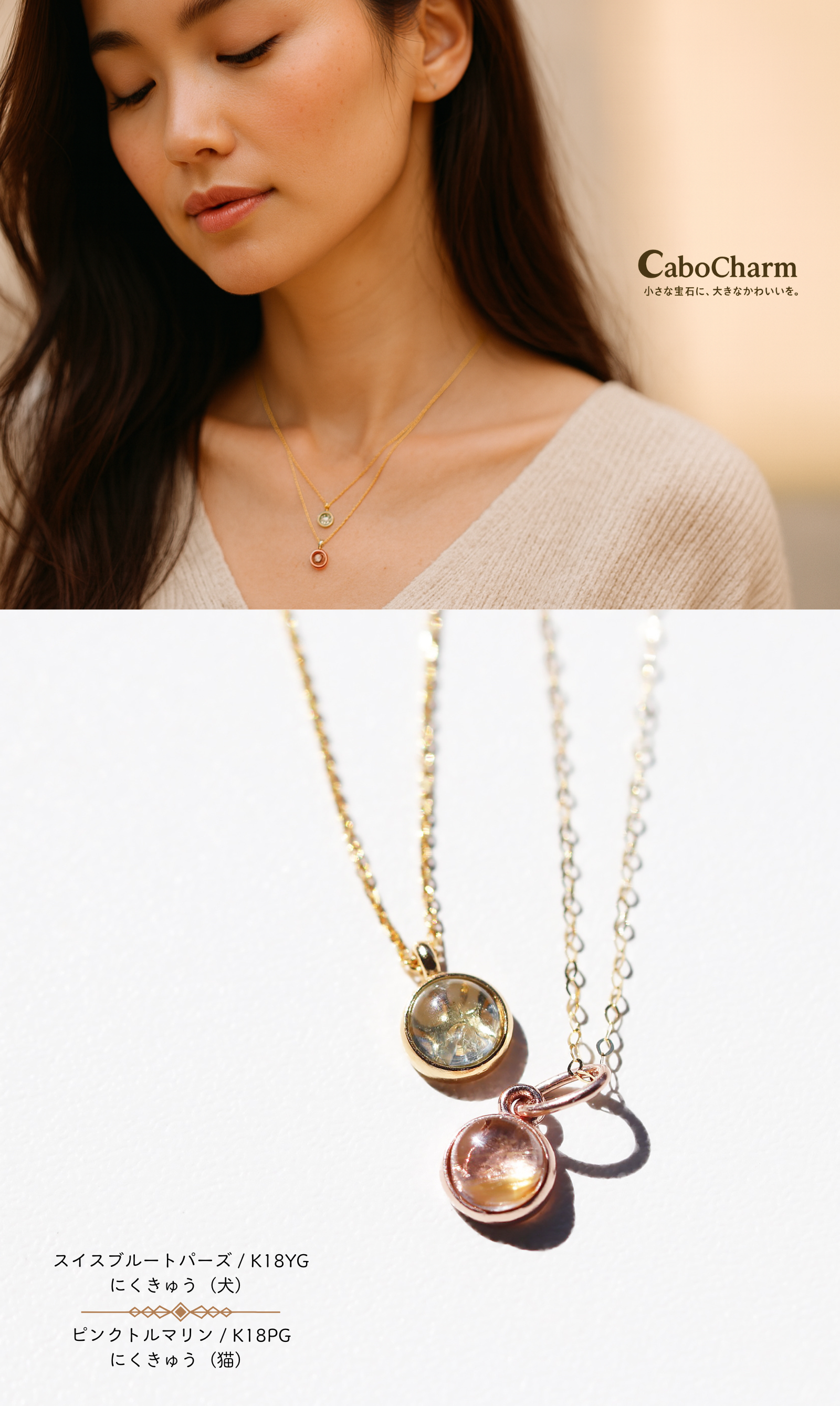 その名の通り、カボションのようにやさしい輝きとチャームのように愛らしい存在感を併せ持つジュエリーです。