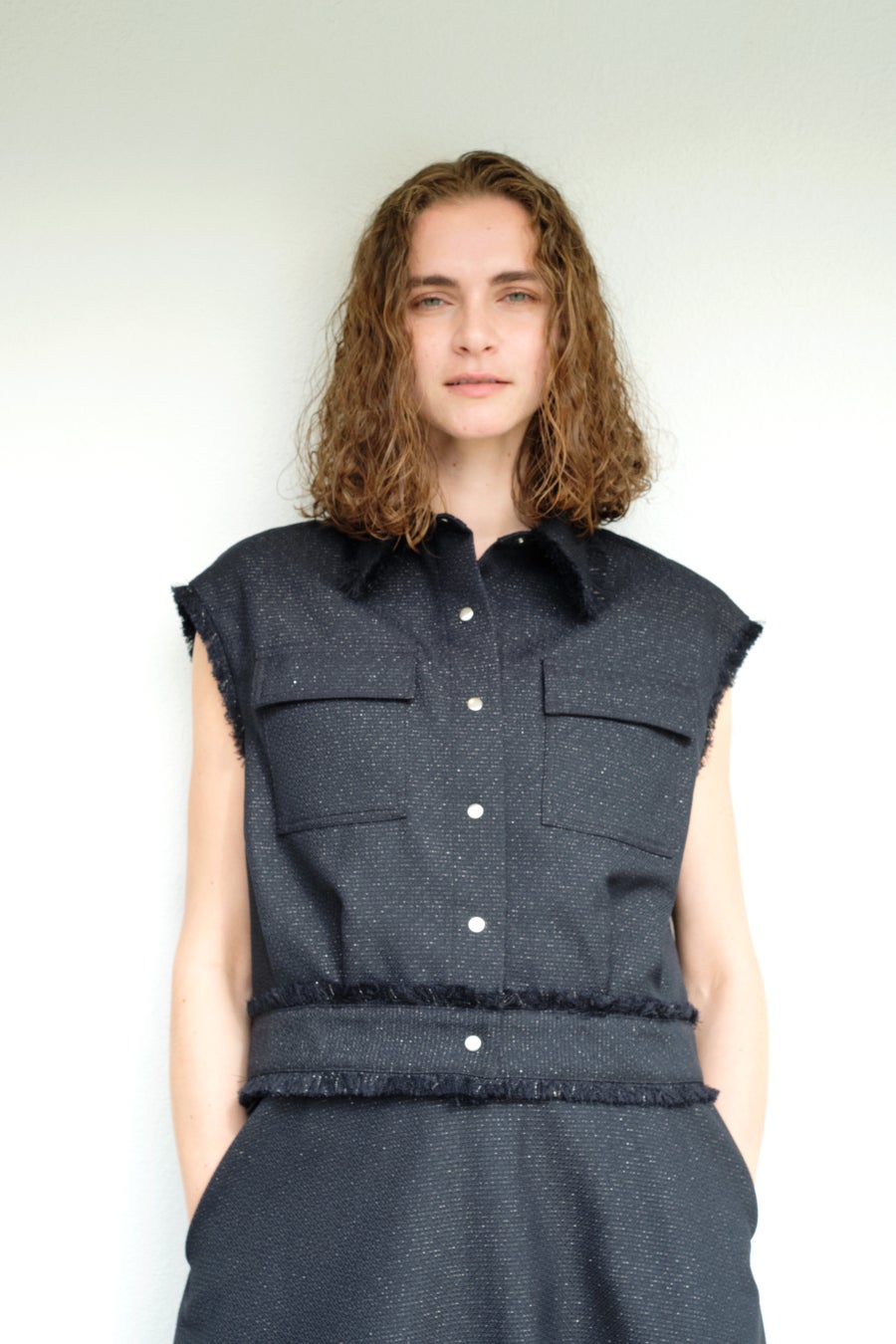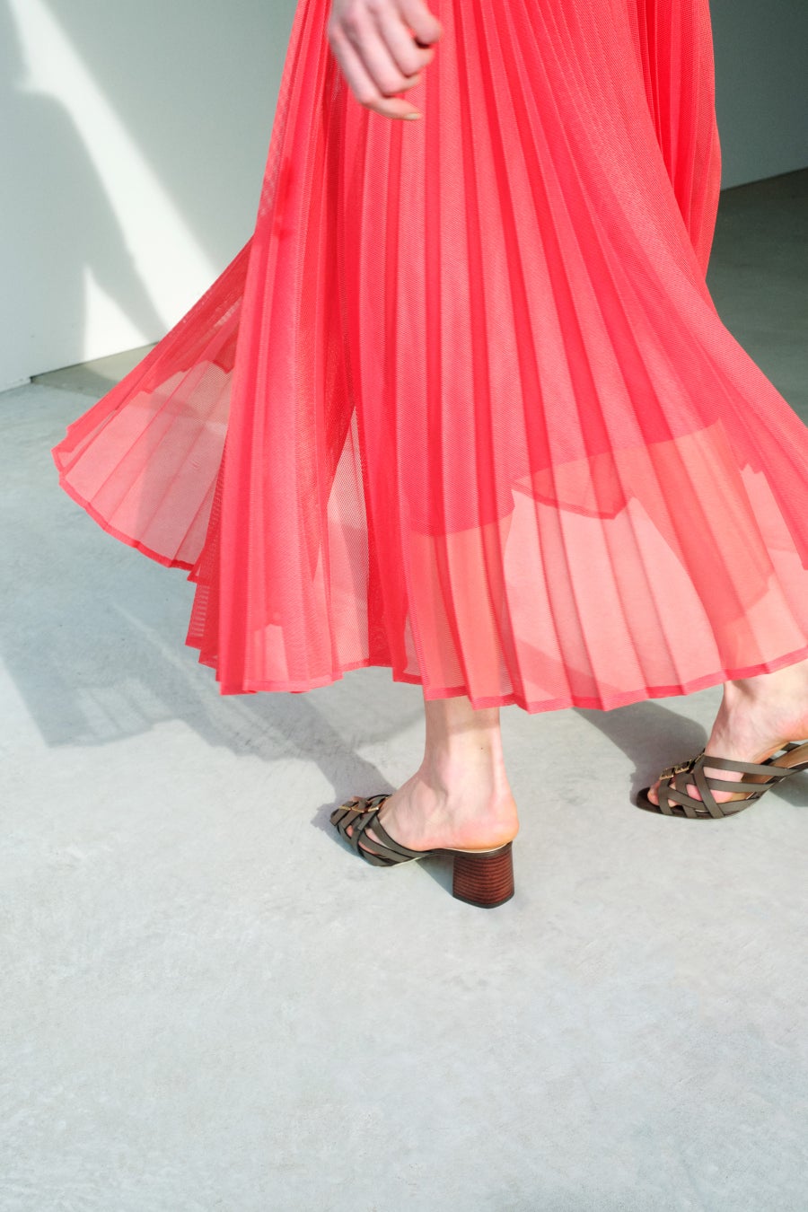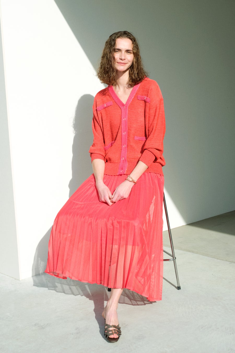 シアー素材のカーディガンは、ロング丈にもハイウエストにも合わせやすいコンパクトな作りに。