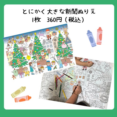 また、「とにかく大きい新聞ぬりえ」は新聞紙ならではのダイナミックさで、お子さんだけでなく大人も童心に帰って楽しめるアイテムです。クリスマス限定塗り絵もご用意しており、自分たちの作品をクリスマス期間に飾って楽しんでいただけます。ぜひ、ご来店いただき実際にお手に取ってご覧ください。