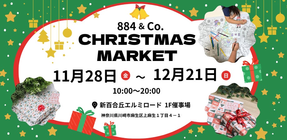 11月28日(金)~12月21日(日)、新百合ヶ丘エルミロードで開催される「884&Co.クリスマスマーケット」に出店し、クリスマス限定のデザイン新聞「つつむ」の一般販売を行います。また人気の高い「とにかく大きい新聞ぬりえ」も新たなデザインを追加し、皆様のお越しをお待ちしています。