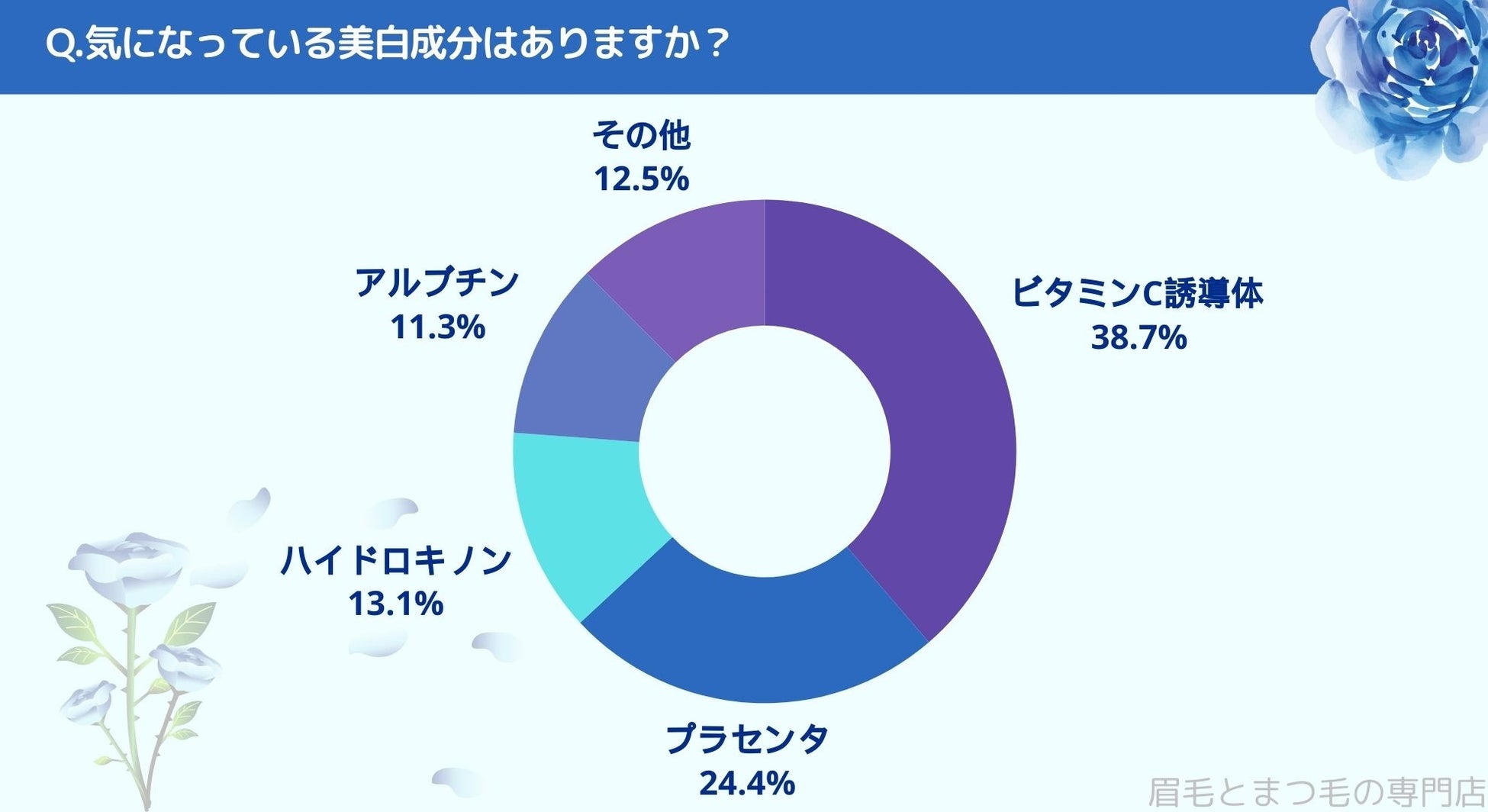 気になっている美白成分をお聞きしたところ「ビタミンC誘導体(38.7%)」、「プラセンタ(24.4%)」、「ハイドロキノン(13.1%)」、「アルブチン(11.3%)」、「その他(12.5%)」という結果になりました。