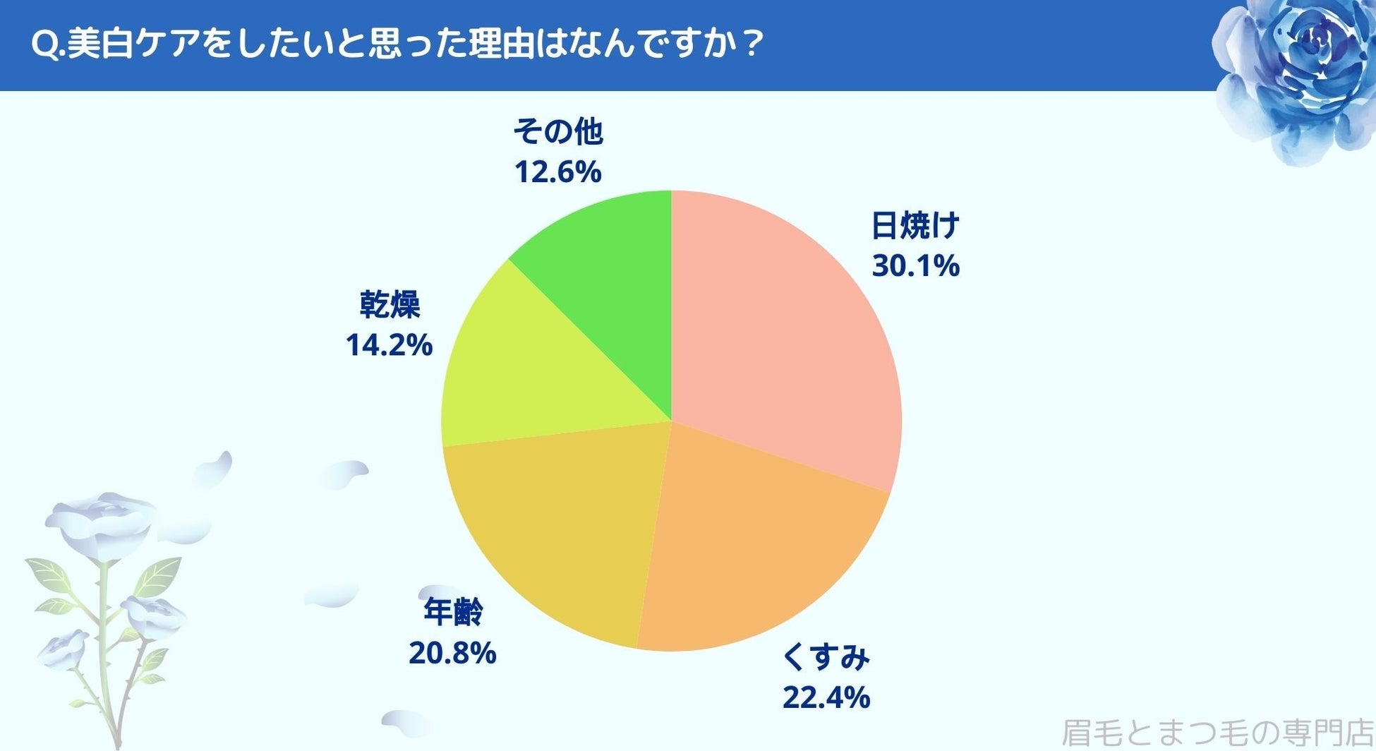 美白ケアをしたいと思った理由をお聞きしたところ「日焼け(30.1%)」」、「くすみ(22.4%)」、「年齢(20.8%)」、「乾燥(14.2%)」、「その他(12.6%)」という結果になりました。