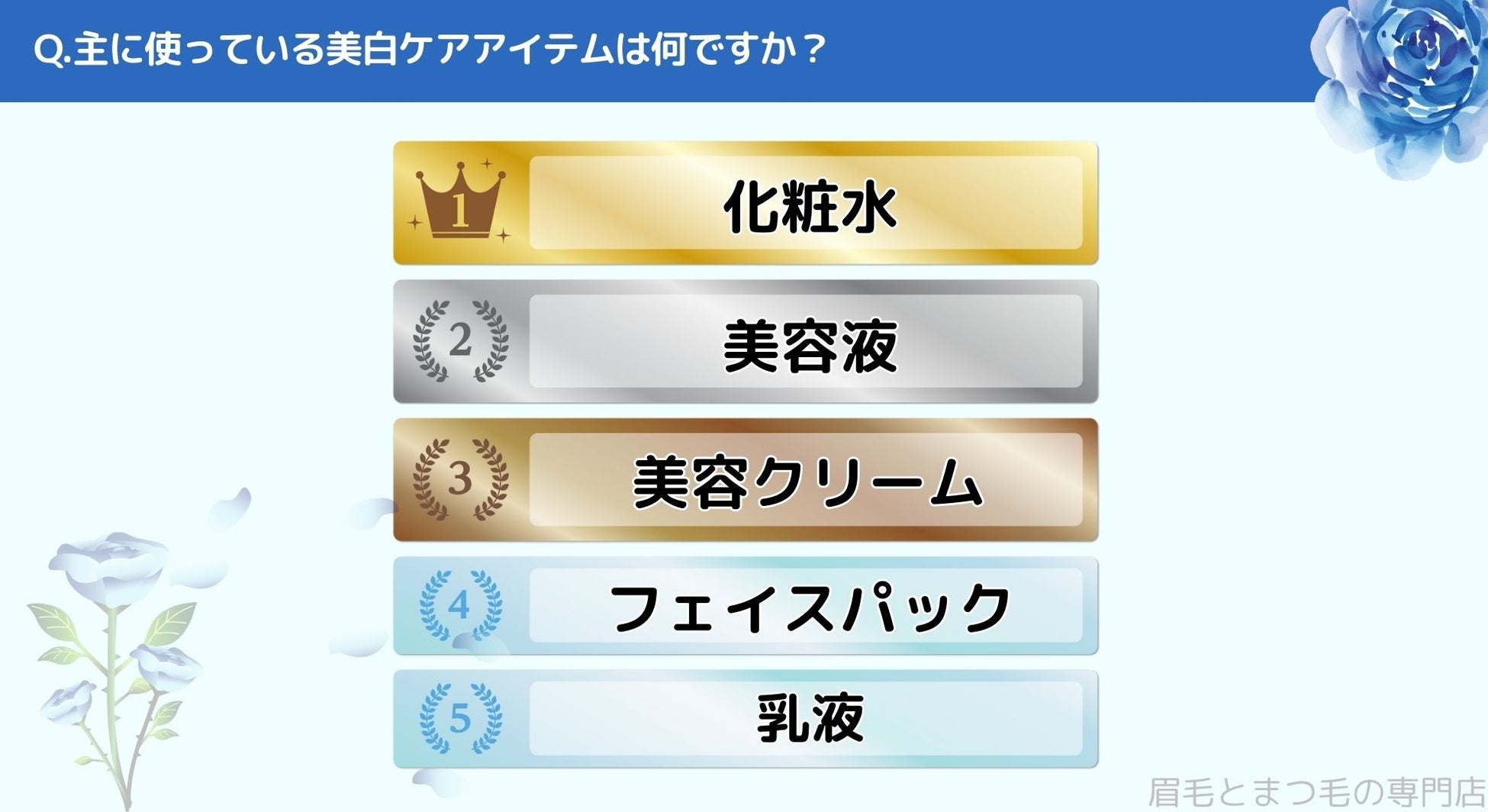 主に使っている美白ケアアイテムをお聞きしたところ「1位>化粧水」、「2位>美容液」、「3位>美容クリーム」、「4位>フェイスパック」、「5位>乳液」という結果になりました。