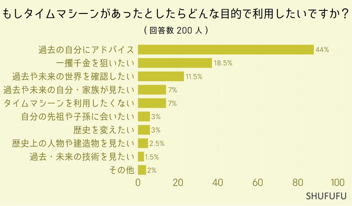 もしタイムマシーンがあったとしたらどんな目的で利用したいかでは「過去の自分にアドバイス」と答える方が1番多かったです。今までの経験からこうしたほうがいいとアドバイスして過去の自分の選択を変えられたらいいですよね。