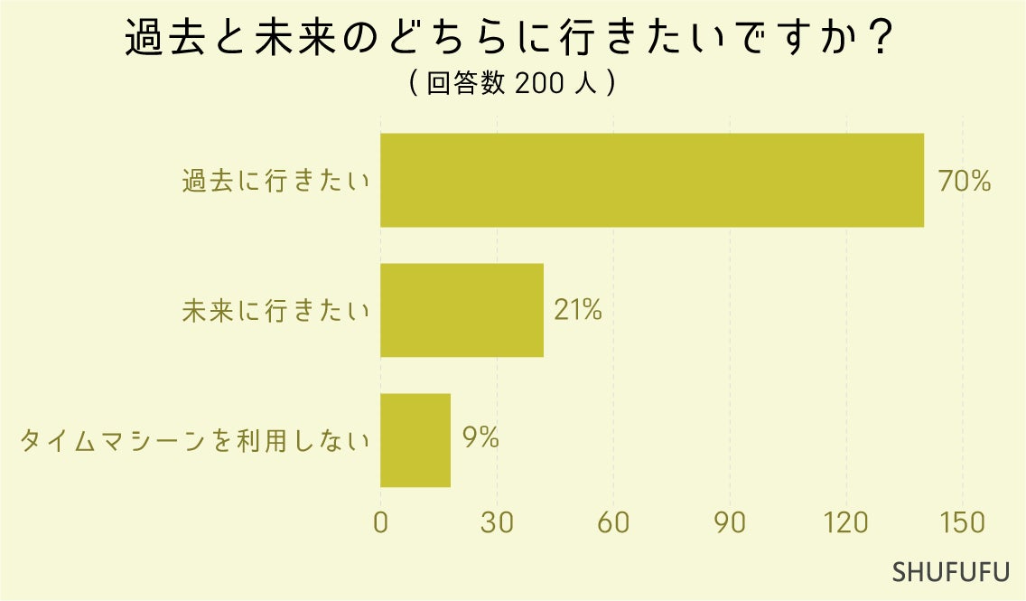 過去と未来のどちらに行きたいかに関しては1位「過去に行きたい(70%)」、2位「未来に行きたい(21%)」でした。タイムマシーンの使用目的でも過去に行ってしたいことが多く挙げられていましたし、こちらでも過去に行きたいという回答が多い結果になりました。